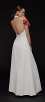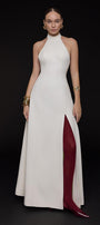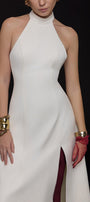 This dress flawlessly combines elegance and comfort. Made with soft cotton, this dress boasts a halter neck and a stunning slit design, perfect for any formal occasion. Embrace style and sophistication while feeling comfortable all night long.