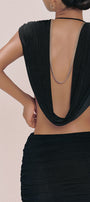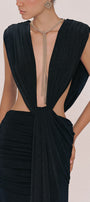 Deep plunging neckline front and back, Bold side cut-out, Draped shoulder detail, Gathered ruched waist