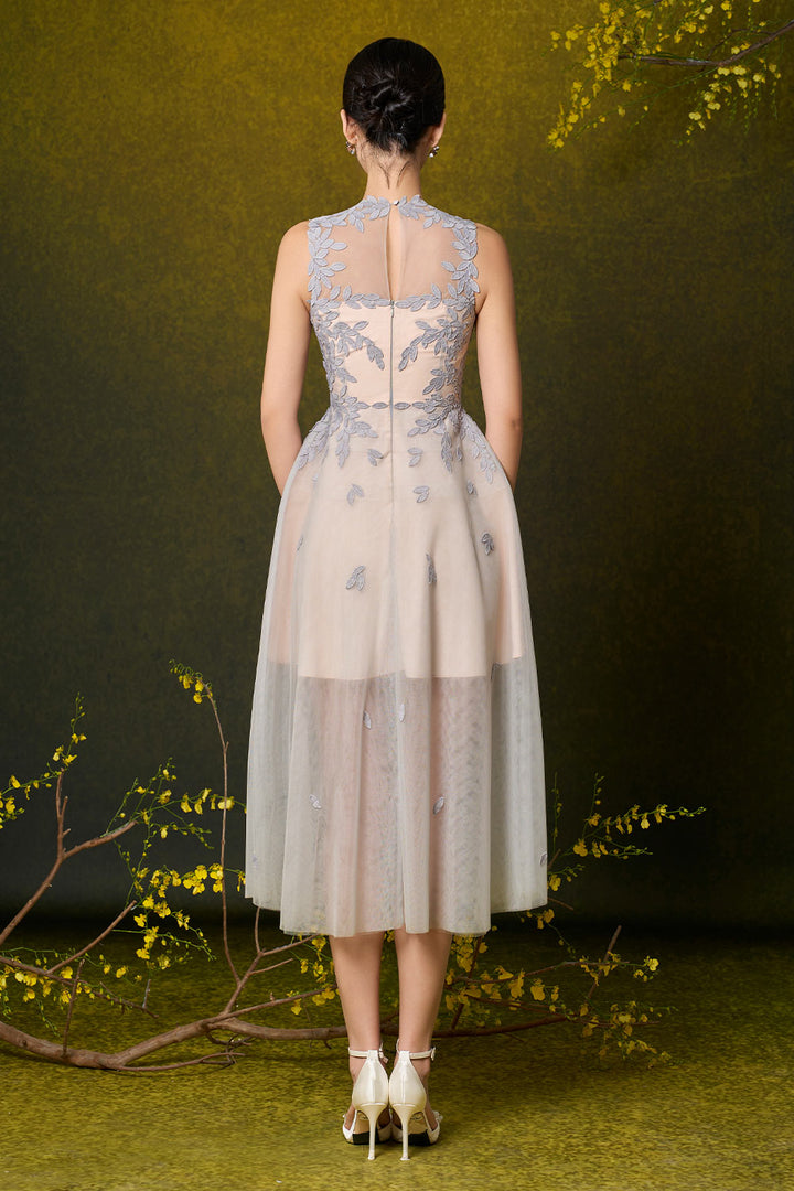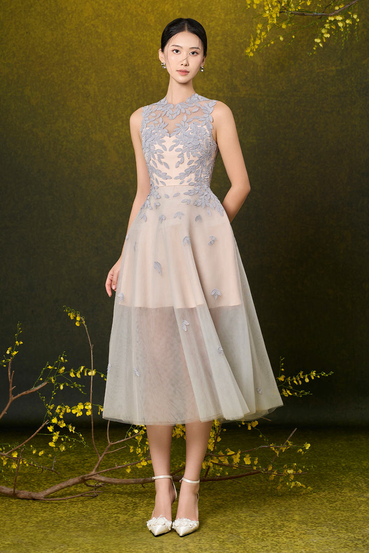 | Special Features | Embroidered leaf pattern on neckline and body, Sheer effect, Short lining, Back zipper, Wavy hem skirt |