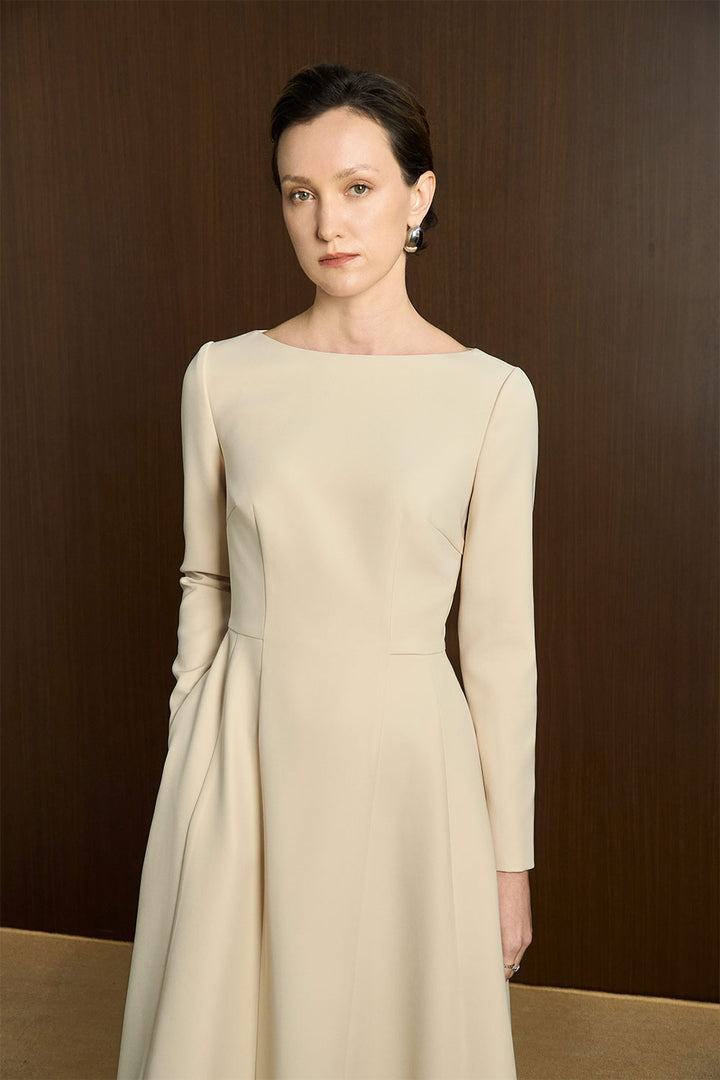Expertly crafted with a boat neck and made from high-quality twill, the dress exudes classic elegance. Its ankle-length cut elongates the silhouette, while its A-line shape flatters all body types. Perfect for any occasion, this dress combines timeless style with comfortable wear.