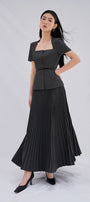 The top presents an architectural silhouette with its distinctive neckline and structured peplum detail. The trapeze neck creates a sophisticated frame for the décolletage while the peplum flare introduces controlled volume at the waist. Crafted from premium wool blend fabric, this top delivers exceptional thermal regulation with a refined texture that maintains its structural integrity throughout wear. The precision tailoring ensures a balanced proportion suitable for professional settings and elevated occasions.