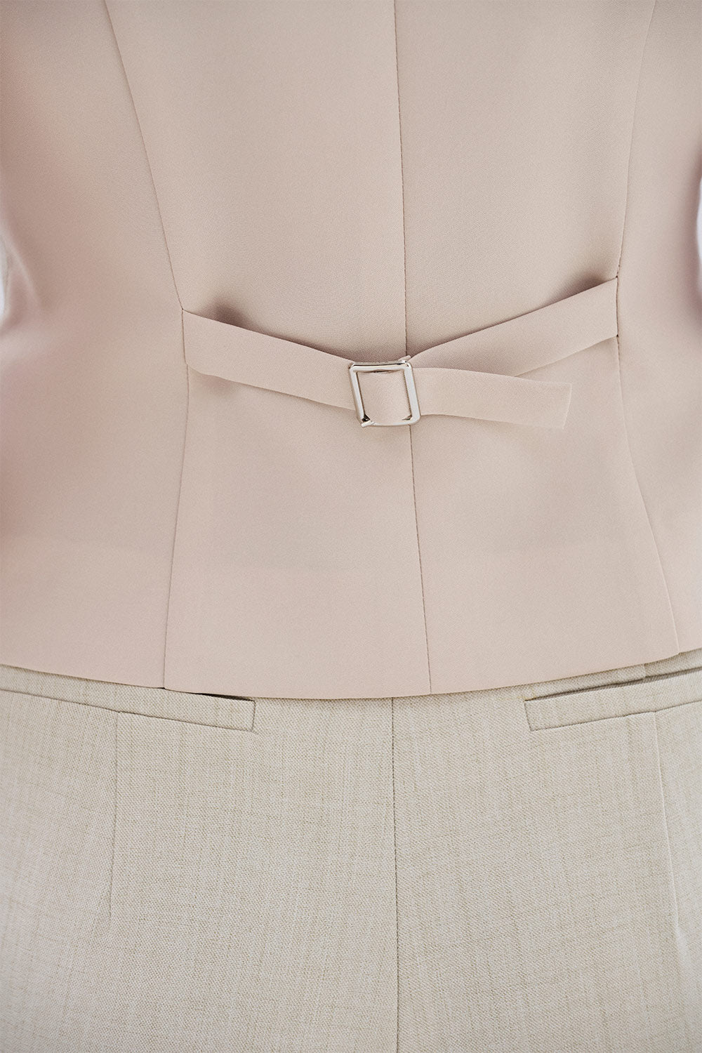 Special Features: Asymmetric button line with matching color button, Welt pocket, Fitted waist with back straps