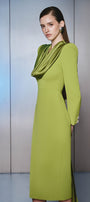 Expertly designed for a sophisticated look, our midi features a cowl neck with a stylish scarf flip at the back. Complete the elegant ensemble with the stone buttons on the cuffs. Enjoy comfort and style in one.
