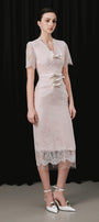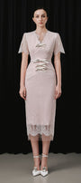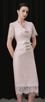 Expertly crafted with a V-neck design and delicate lace, the dress exudes sophistication. The leather bow decoration adds a touch of elegance, making it a must-have for any special occasion. Elevate your style with this stunning dress.
