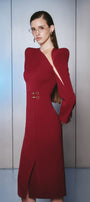 Square pointed shoulder, Cut-out with nude fabric cover, Double metal rings on the waist, Dart lines, Front slit, Metal button cuffs