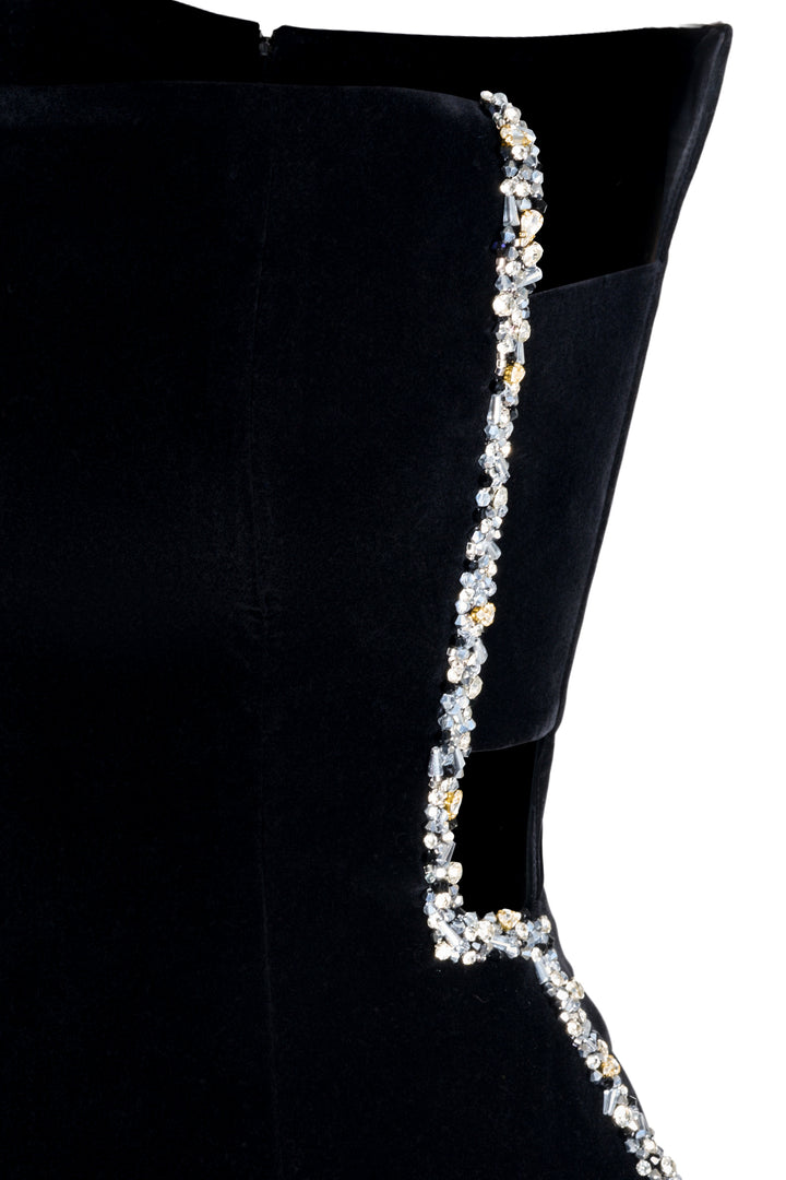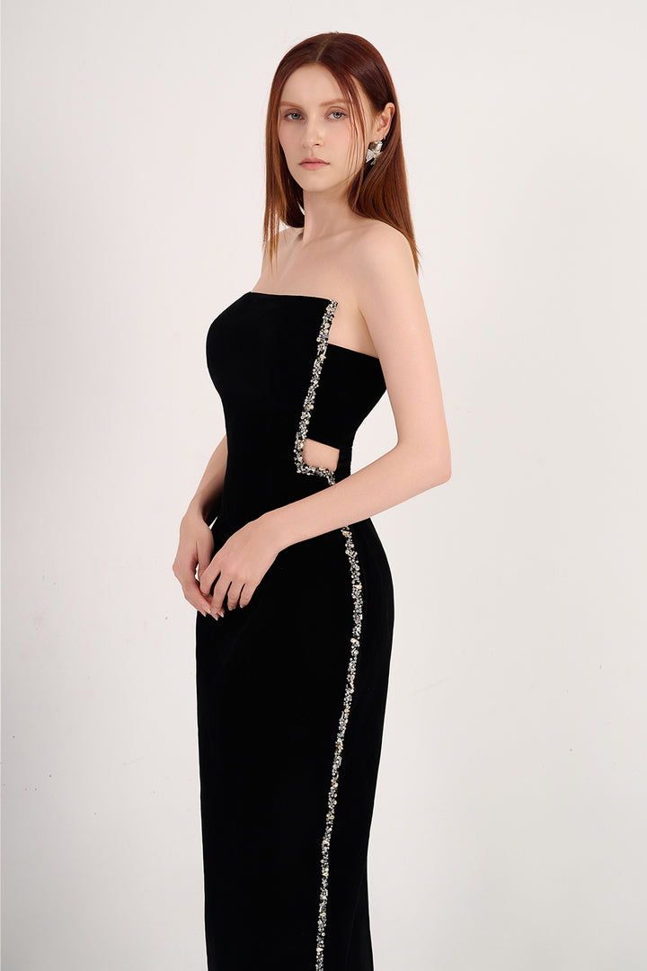 Special Features Attached rhinestone on the side edge, Cut-out waist detail, Slit back