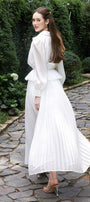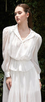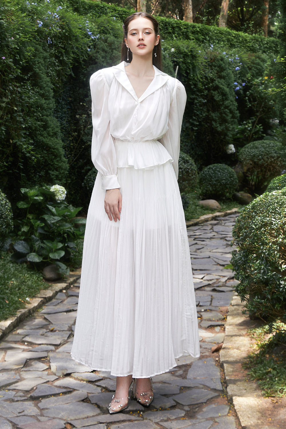 Elevate your wardrobe with this expertly tailored peplum top, featuring a refined V-neck and sophisticated cuff sleeves. The pleated detailing enhances its elegant silhouette, making it a perfect choice for work events, dinners, or special gatherings.
