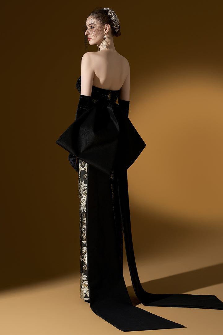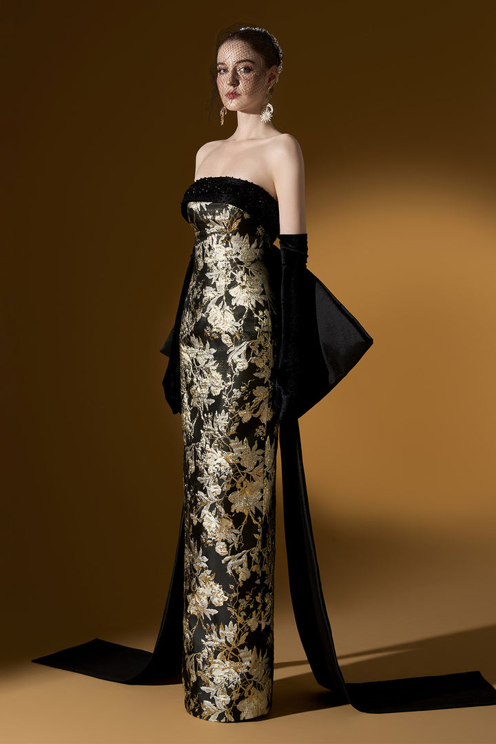 Bellamy Strapless Bow Tie Jacquard Floor Length Dress