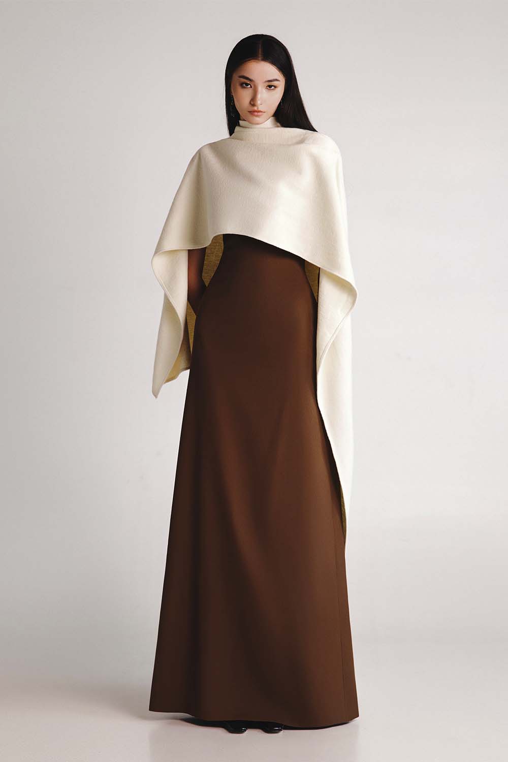 Discover the perfect blend of warmth and sophistication with DA Ivory Luxurious Asymmetric Wool Cape. The design features a clean, minimalist aesthetic with a soft, textured finish. Its structured yet fluid silhouette gracefully drapes over the shoulders for a contemporary yet timeless appeal. Ideal for layering during cooler seasons, this versatile and lightweight piece effortlessly transitions from casual daytime wear to formal evening looks.