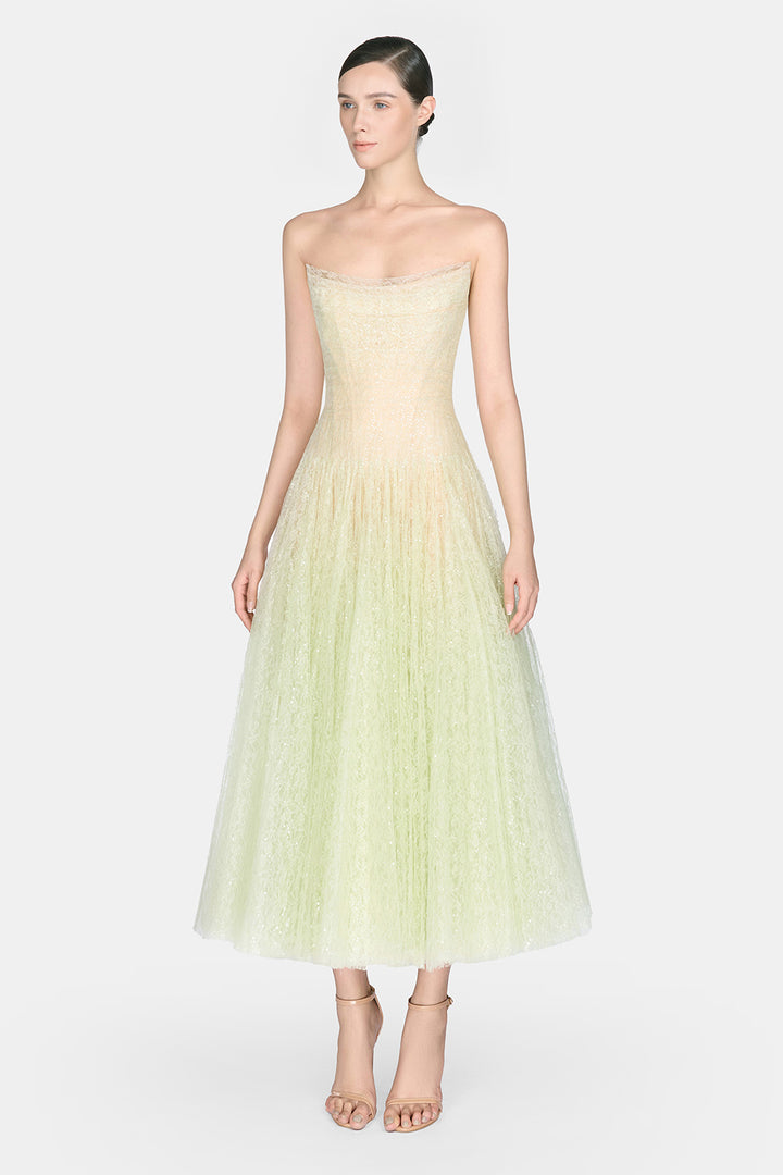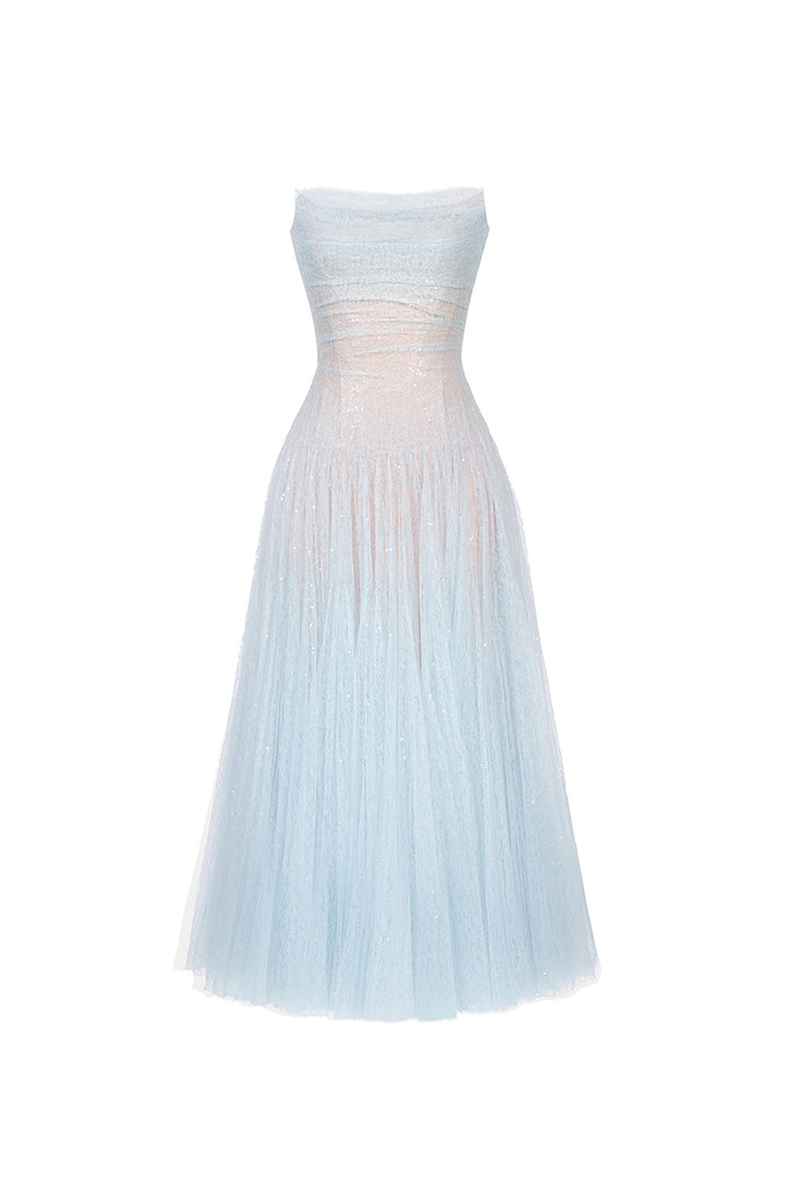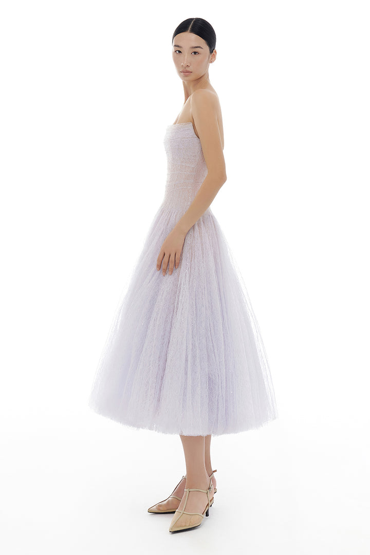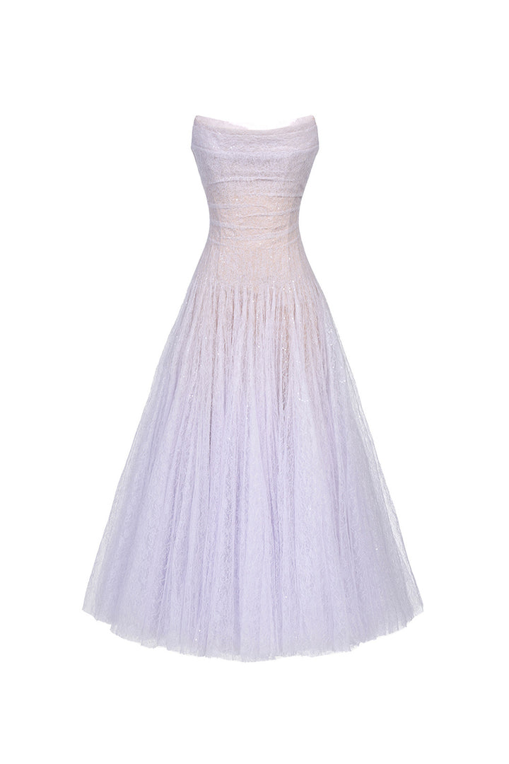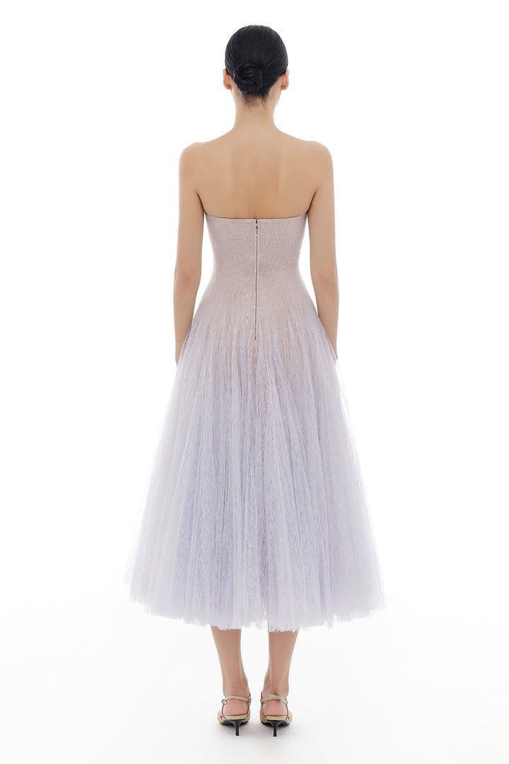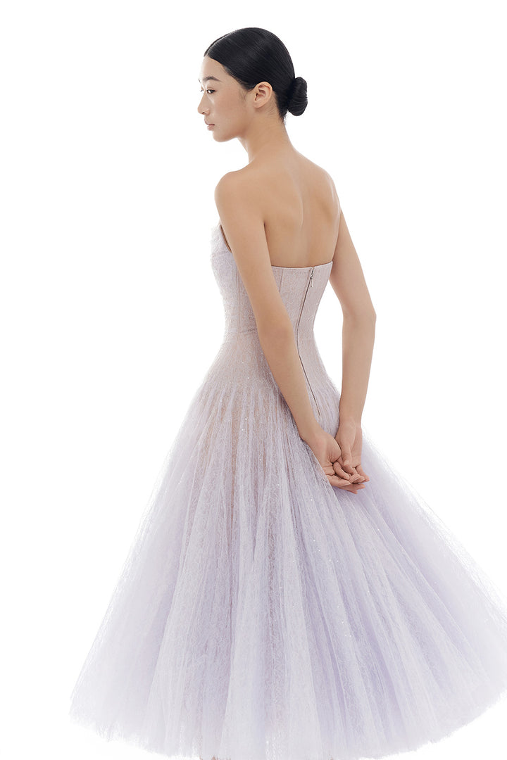 Special Features Strapless dress with corset waist design, Glitter effect with sequin, Gathered flare skirt, Hidden back zipper, Draped layer bodies
