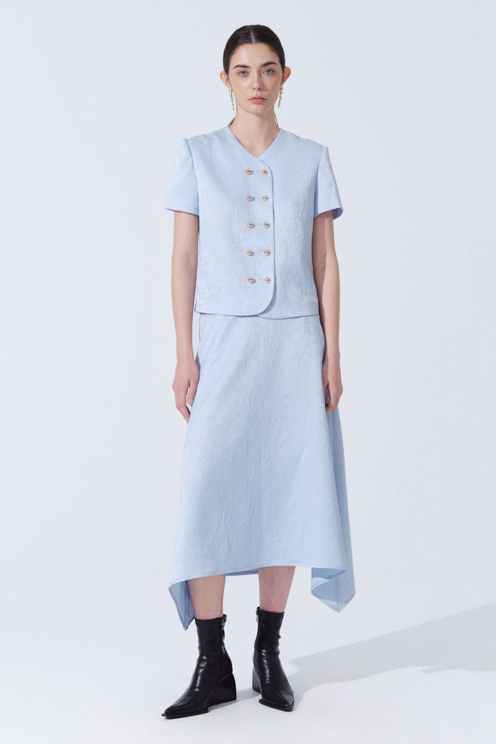 The skirt boasts a chic A-line design, adding a touch of elegance to any outfit. The layered construction provides a flattering fit while enhancing movement, making it perfect for any occasion. Expertly crafted with luxurious brocade fabric, this maxi skirt offers a sophisticated and stylish look.