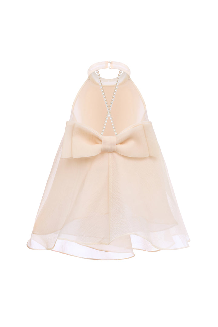 | Special Features | Halter neck with two pearl buttons at the back, Tiered layered front bodice, Open back with criss-cross pearl straps, Fixed oversized bow |