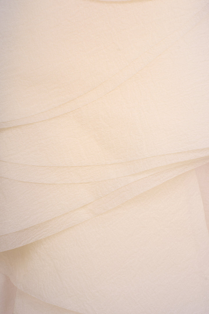 This top features a sophisticated halter-style neckline secured with two elegant pearl buttons at the back. Its slightly A-line silhouette offers a relaxed fit, while the tiered layered front bodice adds dimension and refined texture. Crafted from crinkle organza, this top combines delicate structure with effortless style, making it a versatile piece for elevated, expert dressing.