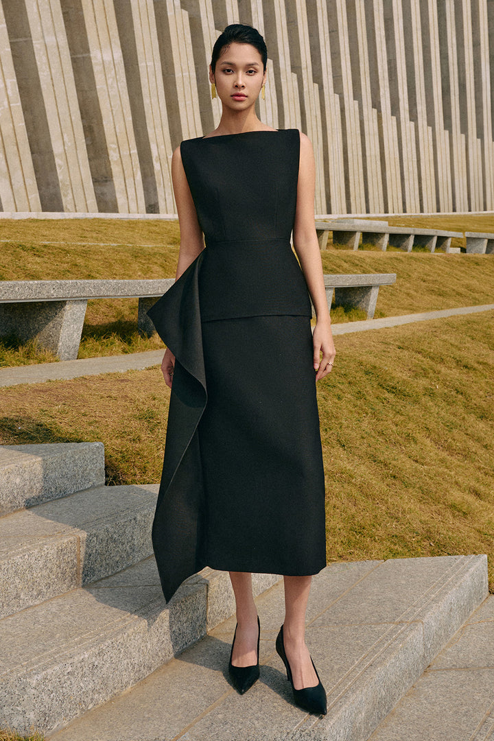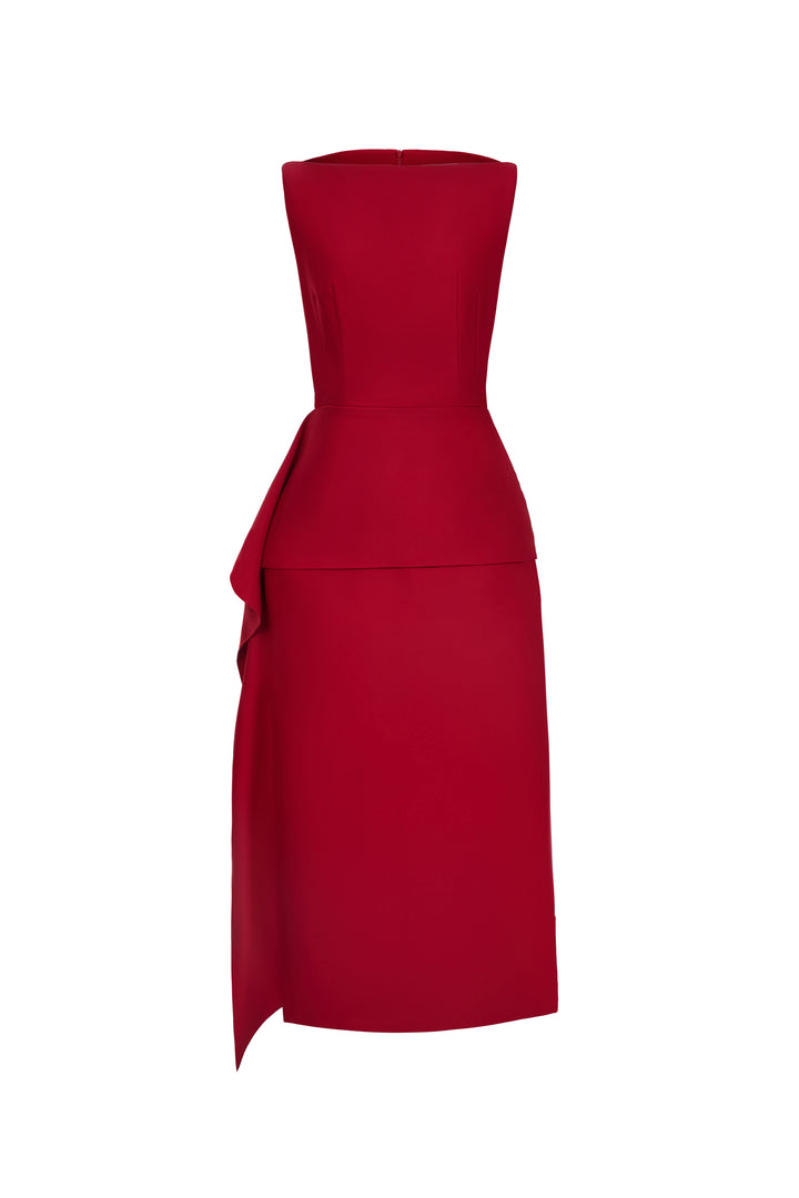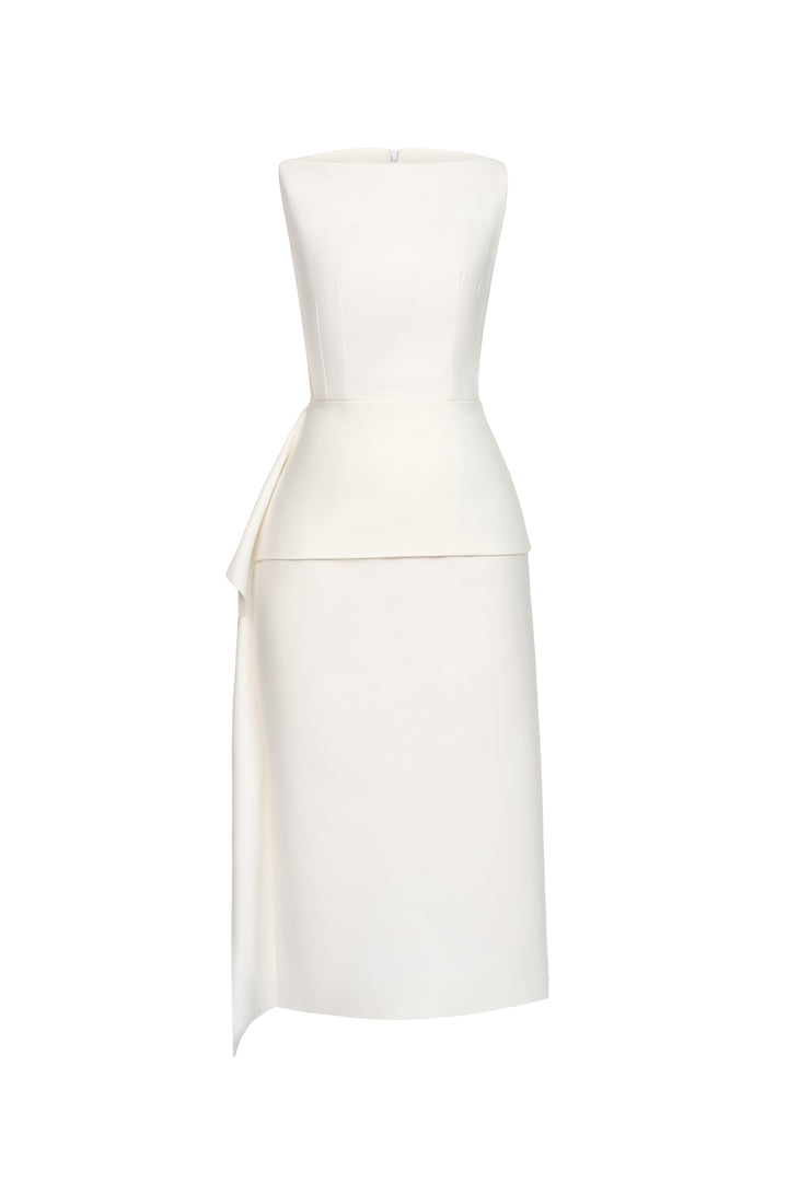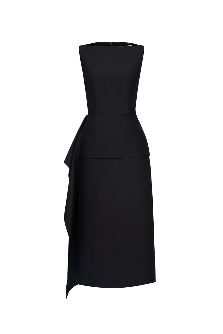 The dress combines sophisticated design with comfort. Crafted from breathable cotton, it features a flattering sheath silhouette and an extended flap detail that adds a modern twist. Ideal for professional settings or elegant occasions, this midi dress offers both style and ease of movement, making it a versatile addition to your wardrobe.