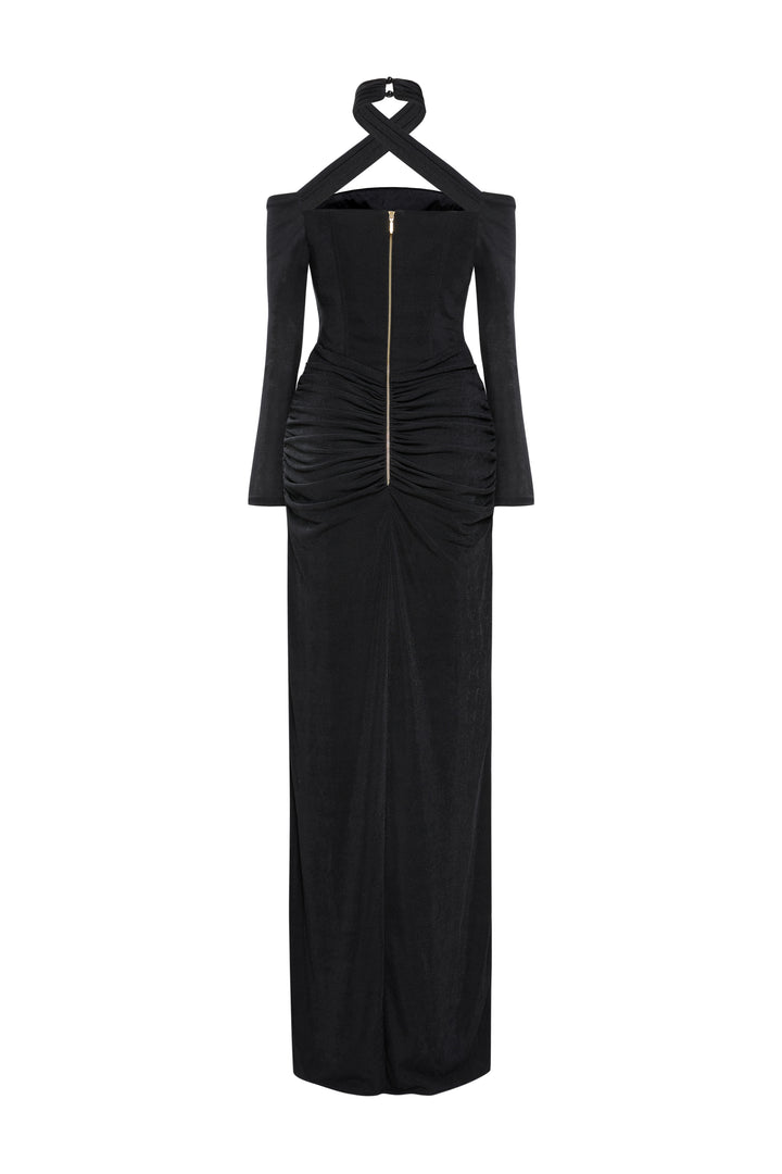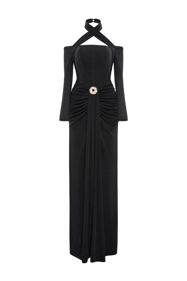 | Special Features | Crossover neckline, Ruched front draping, Half open back |