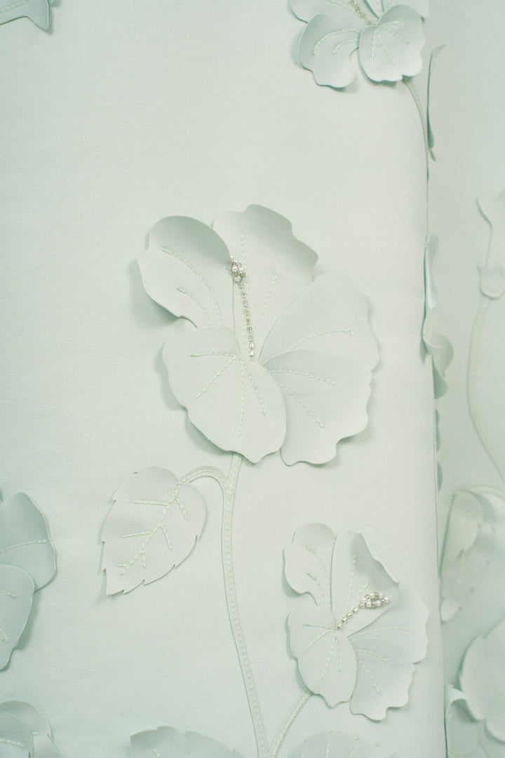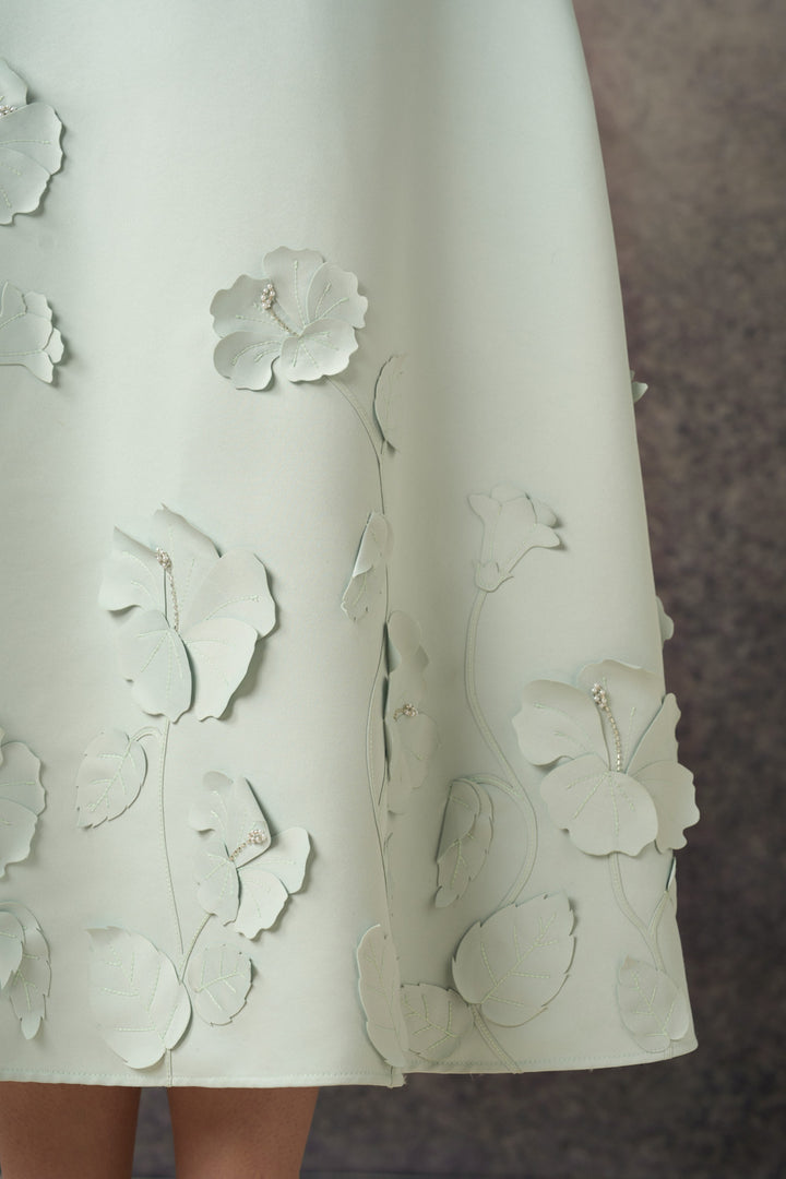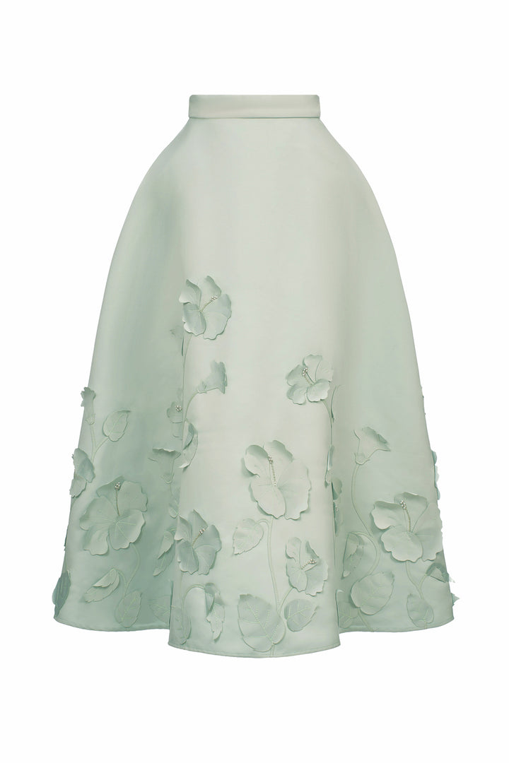 This skirt features intricate 3D floral appliques adorned with delicate beads, adding texture and elegance. Its flared silhouette enhances movement and creates a graceful shape, while the high-quality taffeta fabric offers a structured yet smooth finish. Perfect for formal occasions, this skirt combines sophisticated craftsmanship with timeless style.