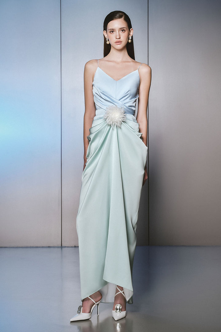 Special Features Crossover at the waist, Draped skirt, Spaghetti straps, Dart lines in the fronts