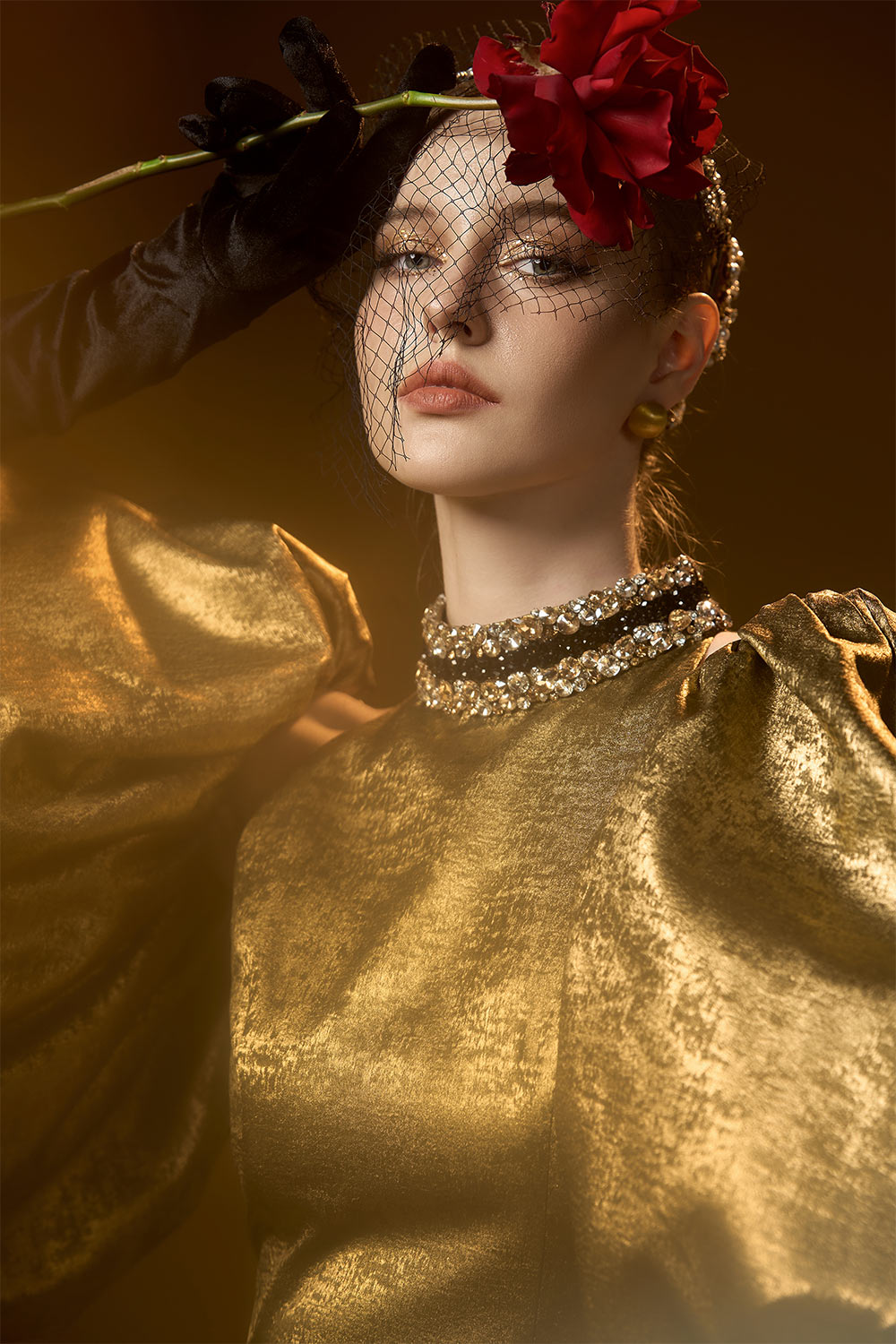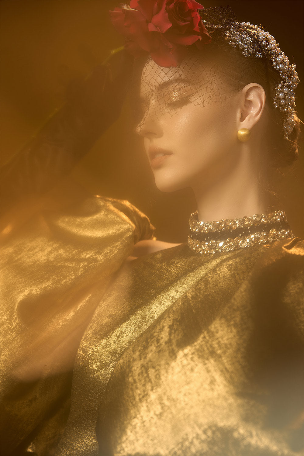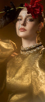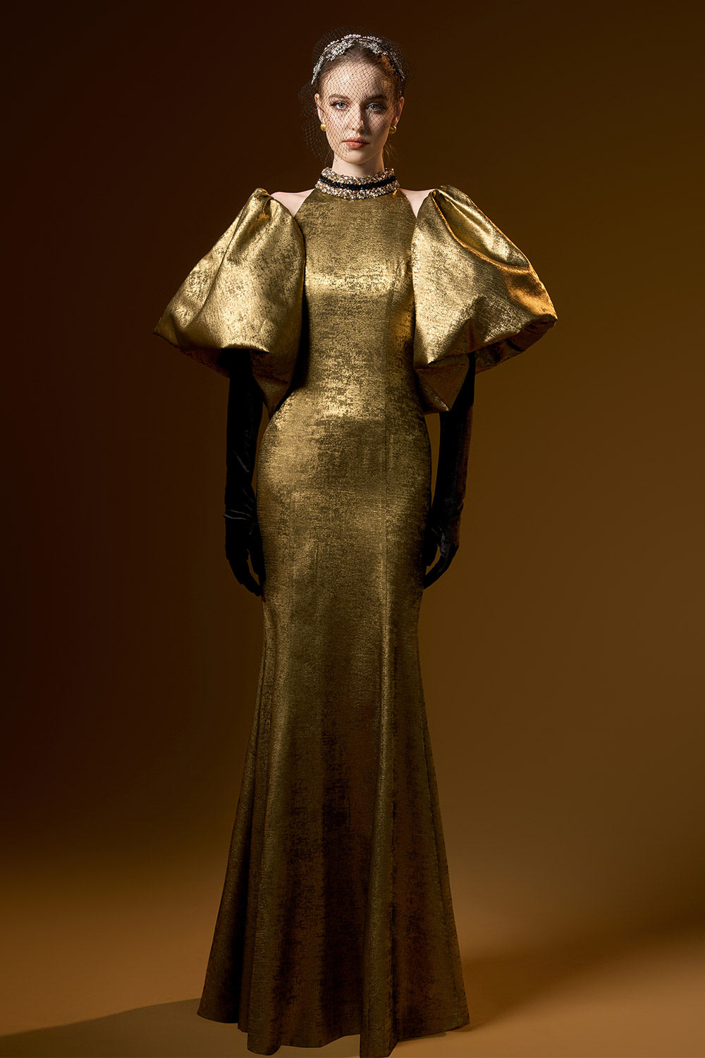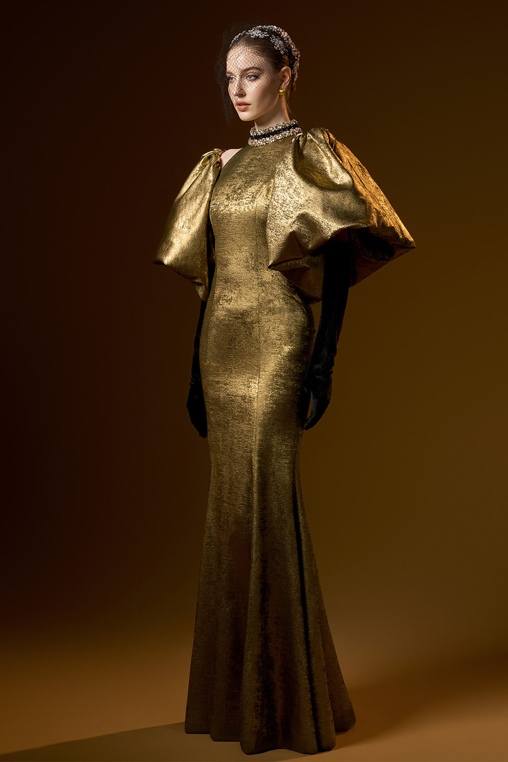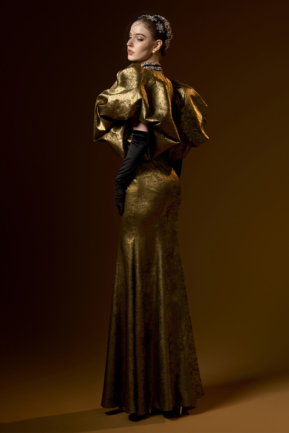 Special Features: Attached crystals and pearls on the neck and cuffs, Undetachable bubble sleeves, Cut-out shoulder, Waist dart along the dress, Wavy flare hem