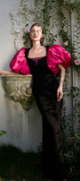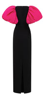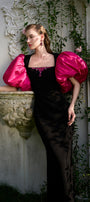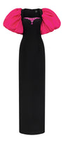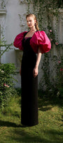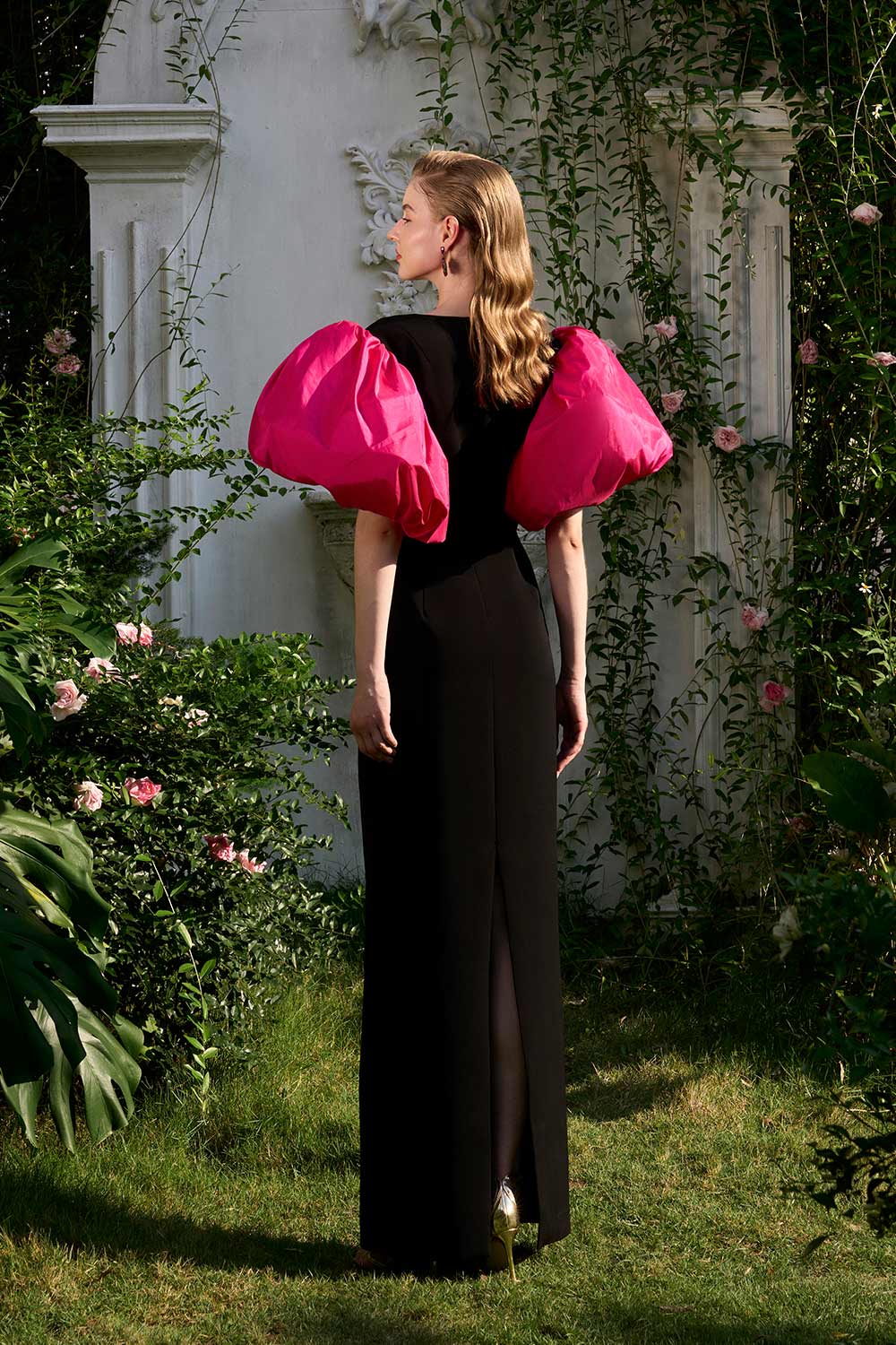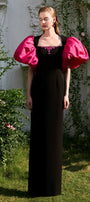 The dress boasts a sheath silhouette with bubble sleeves to add a modern touch. Made with crepe material, it drapes beautifully and provides a floor length fit. Elevate your style with this chic and versatile dress.