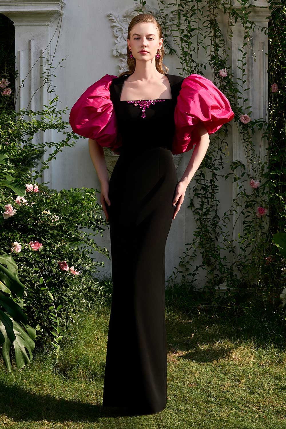 Special Features: Embellished crystal on the neckline, Big bubble taffeta sleeves, Dart line, Slit back