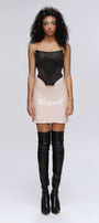 Elevate your evening wardrobe with the mini dress, featuring a structured corset-style upper that enhances your silhouette with expert precision. The intricate brocade fabric pairs seamlessly with a shimmering sequin skirt, creating a striking contrast that commands attention. Perfect for special occasions, this dress combines sophisticated tailoring with glamorous details to ensure you stand out with confidence and style.