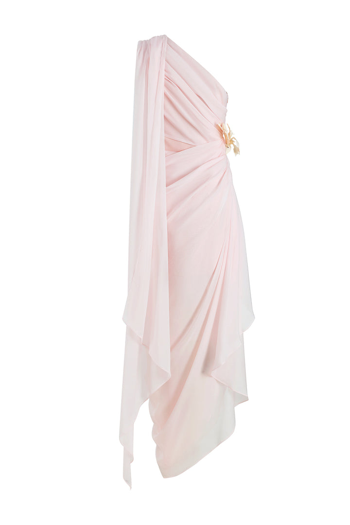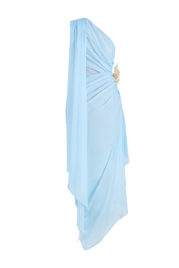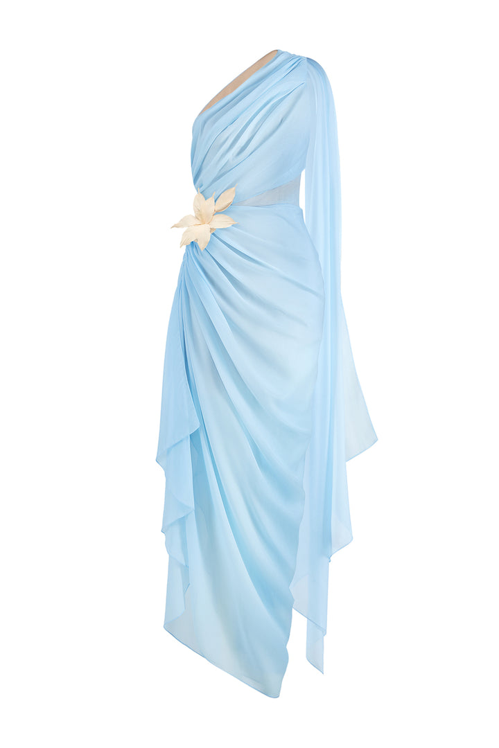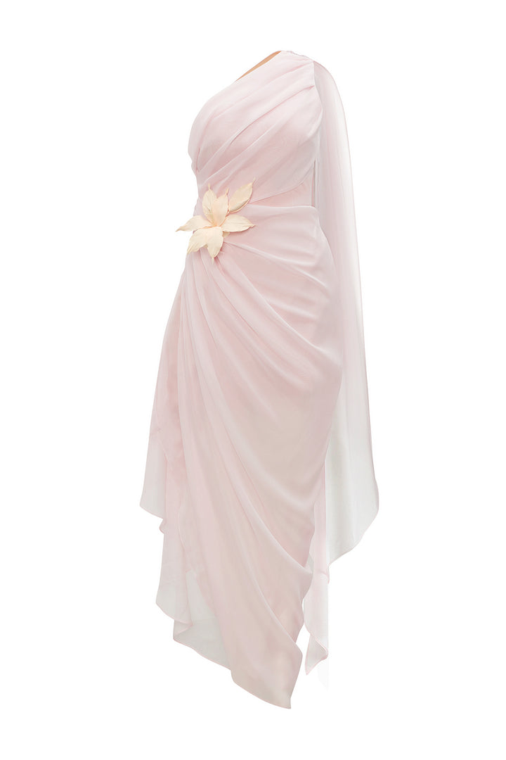 The midi dress features a sophisticated one-shoulder design paired with a delicately gathered bodice, creating an elegant silhouette that flatters the figure. Crafted from lightweight silk organza, this midi dress offers a refined texture and subtle sheen, perfect for occasions that call for understated luxury. Its design draws inspiration from timeless muses, blending classic artistry with modern tailoring to elevate your wardrobe with effortless grace.