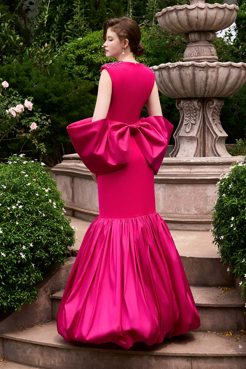 Bubble taffeta hem skirt, Detachable big bow at the back, Embellished crystal on the square shoulder, Drop waist