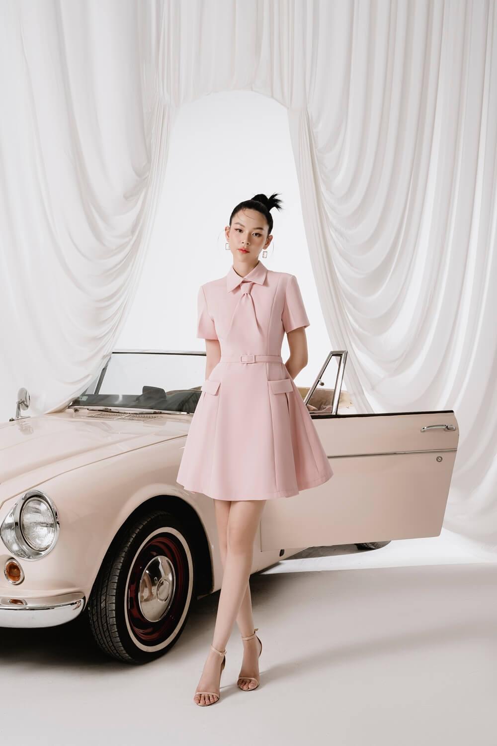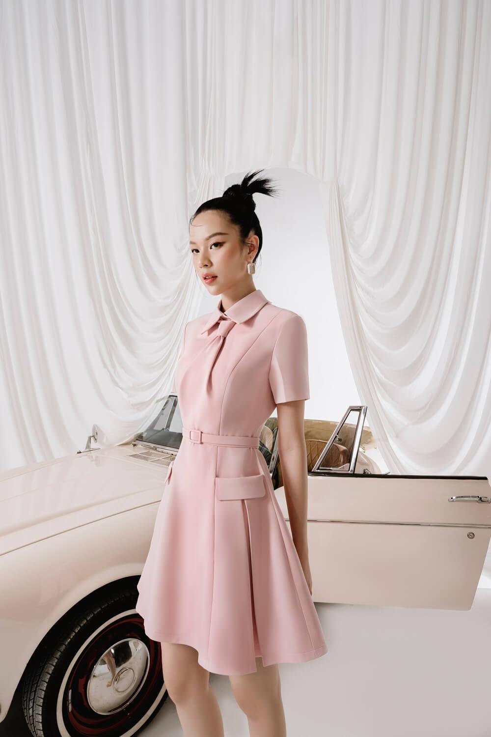 The dress is a harmonious combination of elegance and feminity that exudes the breath of modernity. On a gentle pink-tone background, a high-quality diamond spandex material is used skillfully to enhance the trendiness of the wearer.