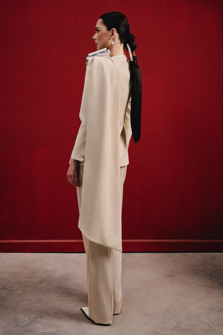The pants offer a sophisticated blend of comfort and style. Crafted from breathable linen-cotton fabric, they feature a floor-length wide-leg silhouette that ensures ease of movement and a flattering fit. Practical side pockets add functionality, while a subtle ribbed line down the center enhances the tailored appearance, making these pants a versatile choice for both casual and polished looks.