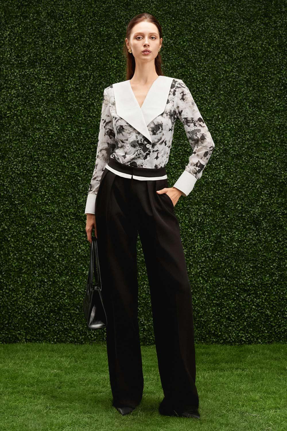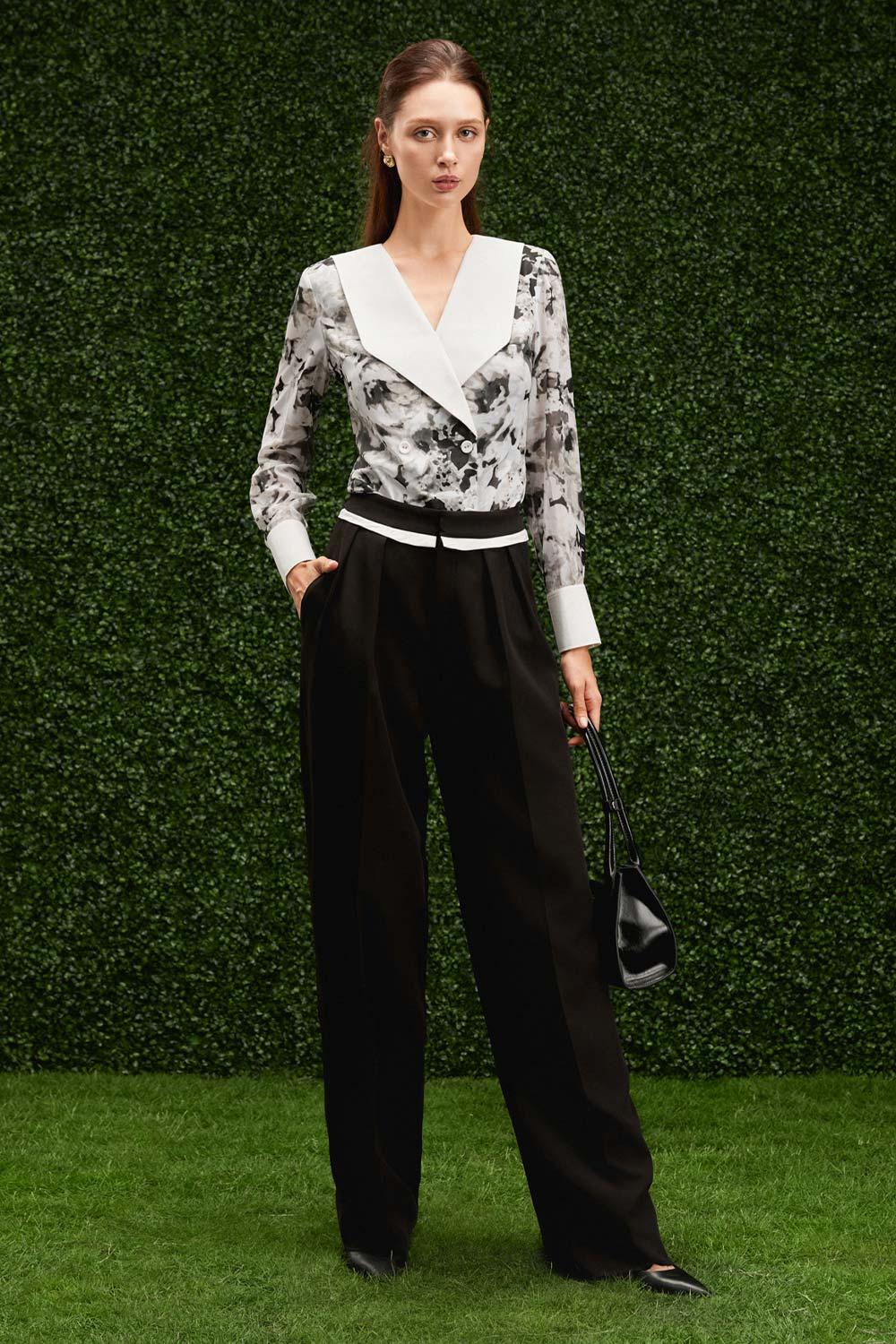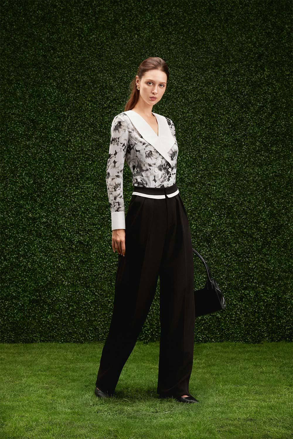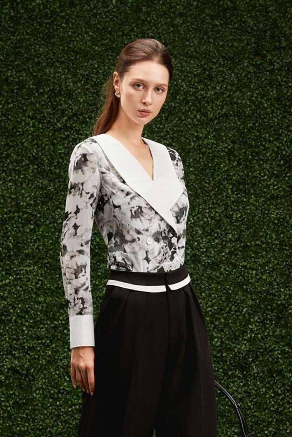 Two-tone collar color, V-neckline with wide notched lapel collar, Slit cuff with buttons row
