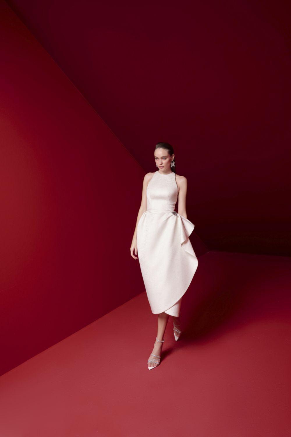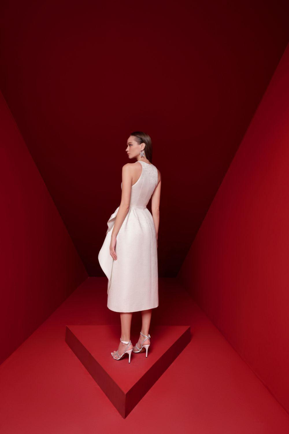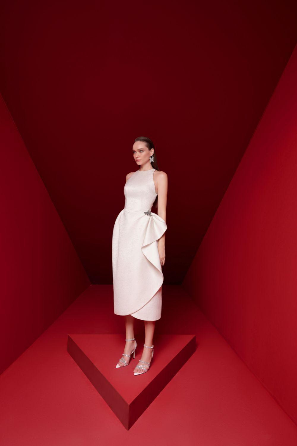 Indulge in the opulent elegance of the midi dress. The wrap silhouette flatters any figure, while the intricate brocade fabric adds a touch of luxury. With its sleeveless design, this dress is perfect for warm weather events. Elevate your style with Alora.