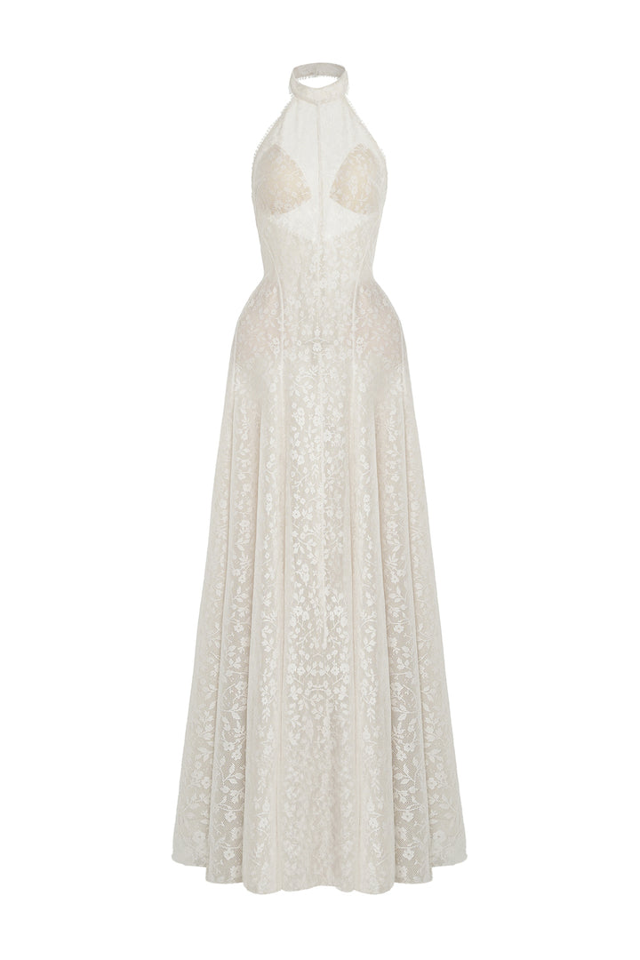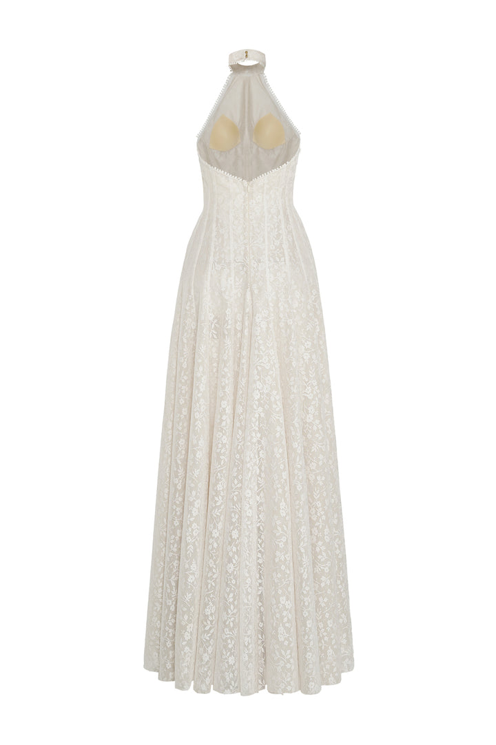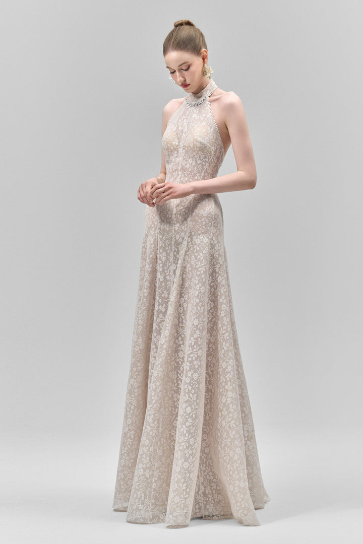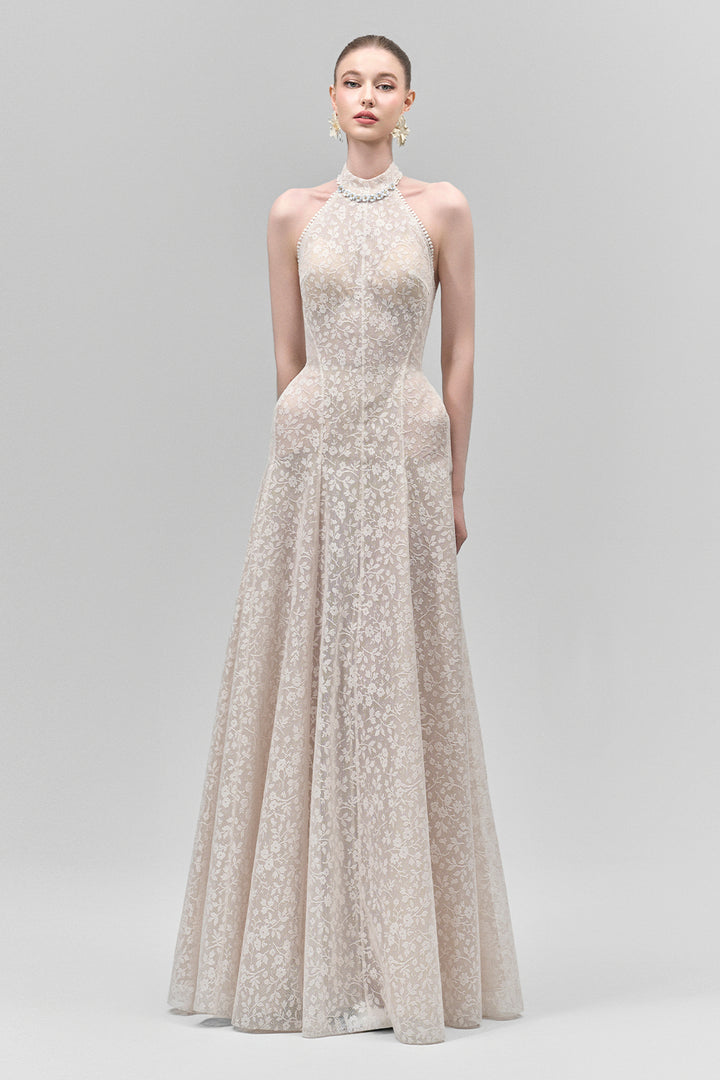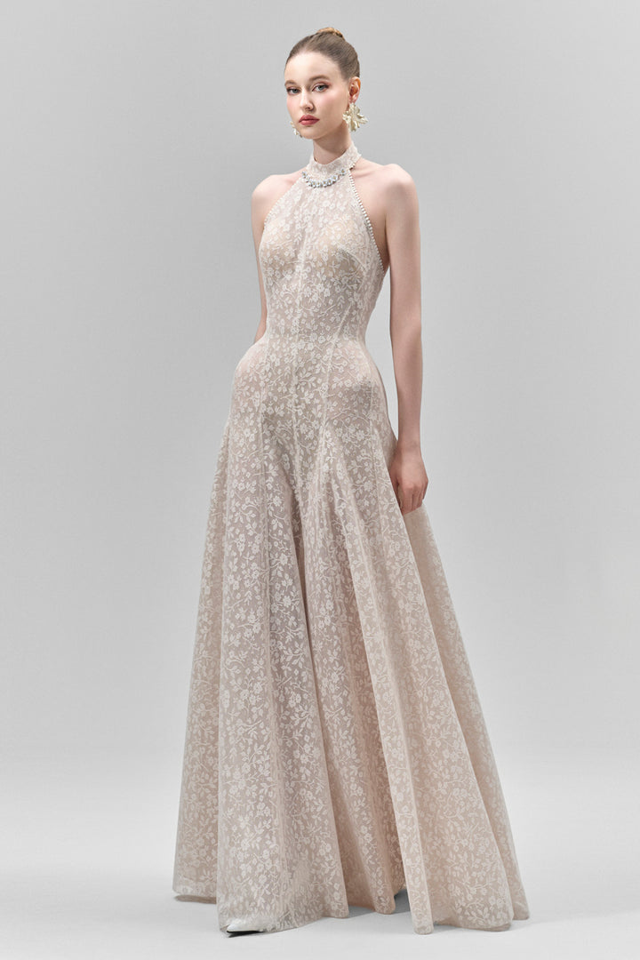 The dress features an elegant halter neckline that highlights the shoulders and décolletage. Delicate lace trim adds sophisticated detailing along the edges, enhancing its feminine appeal. Carefully placed dart lines provide a tailored fit through the bodice, ensuring a flattering silhouette that flows gracefully to the floor. This dress combines refined craftsmanship with timeless design for a polished and confident look.
