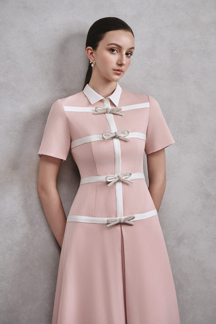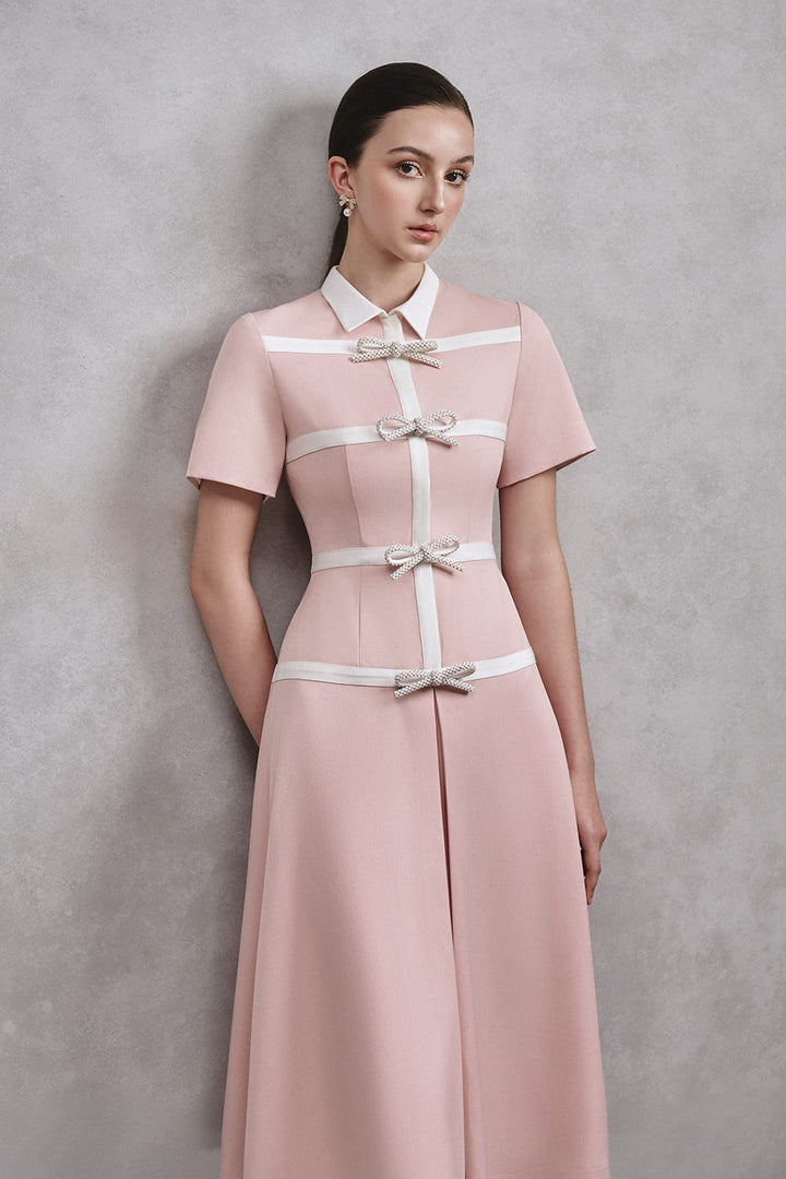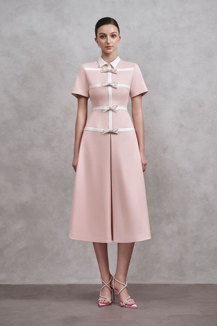 This dress offers a modern and elegant look in a charming shade of pink. The collared neck adds a touch of sophistication, while the bow detail adds a playful touch. Made with high-quality cotton, this dress is both stylish and comfortable.