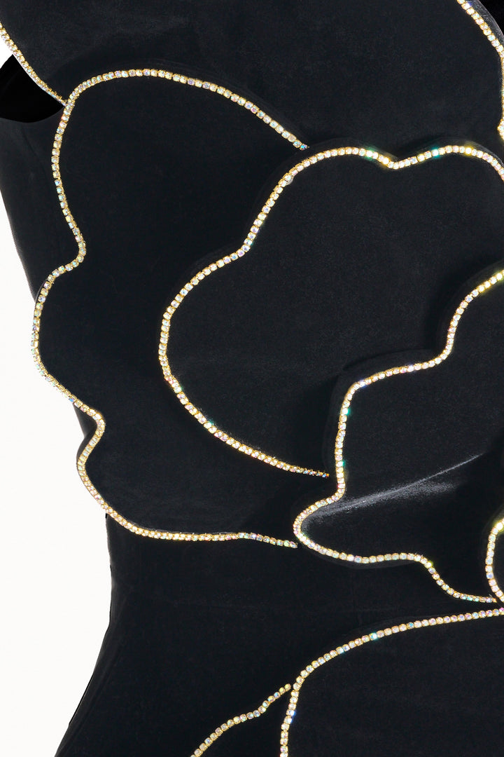 Special Features Detachable sheer cape, 3D floral design with crystal on the petal trim, Side slit