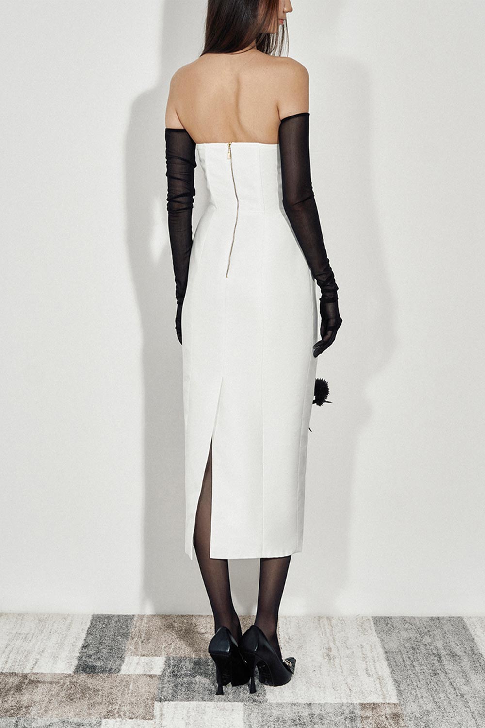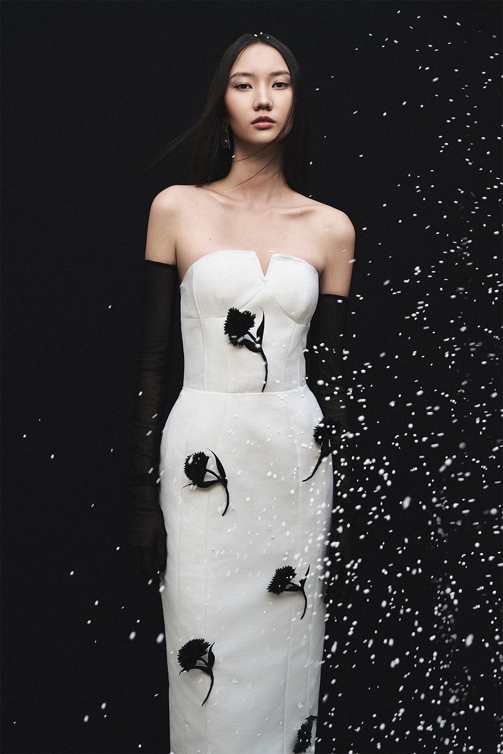 Special Features: Padded bust, Open shoulder, V-frame creates V front cleavage, Back slit, Golden metallic zipper, 3D carnations on the front