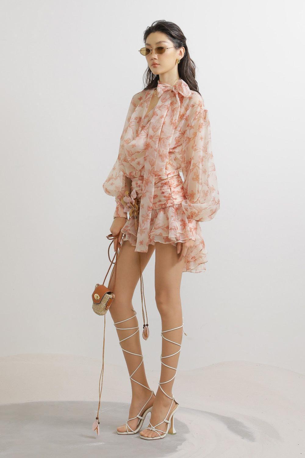 Camryn Blouson Tie Neck Chiffon Mini Dress