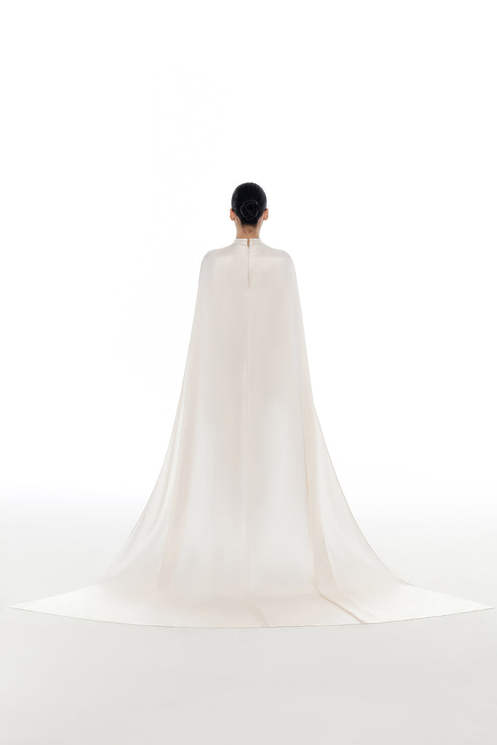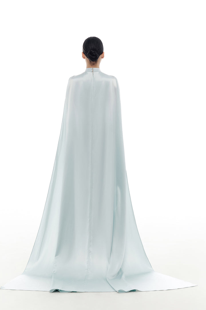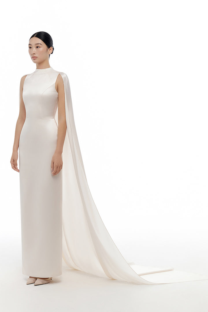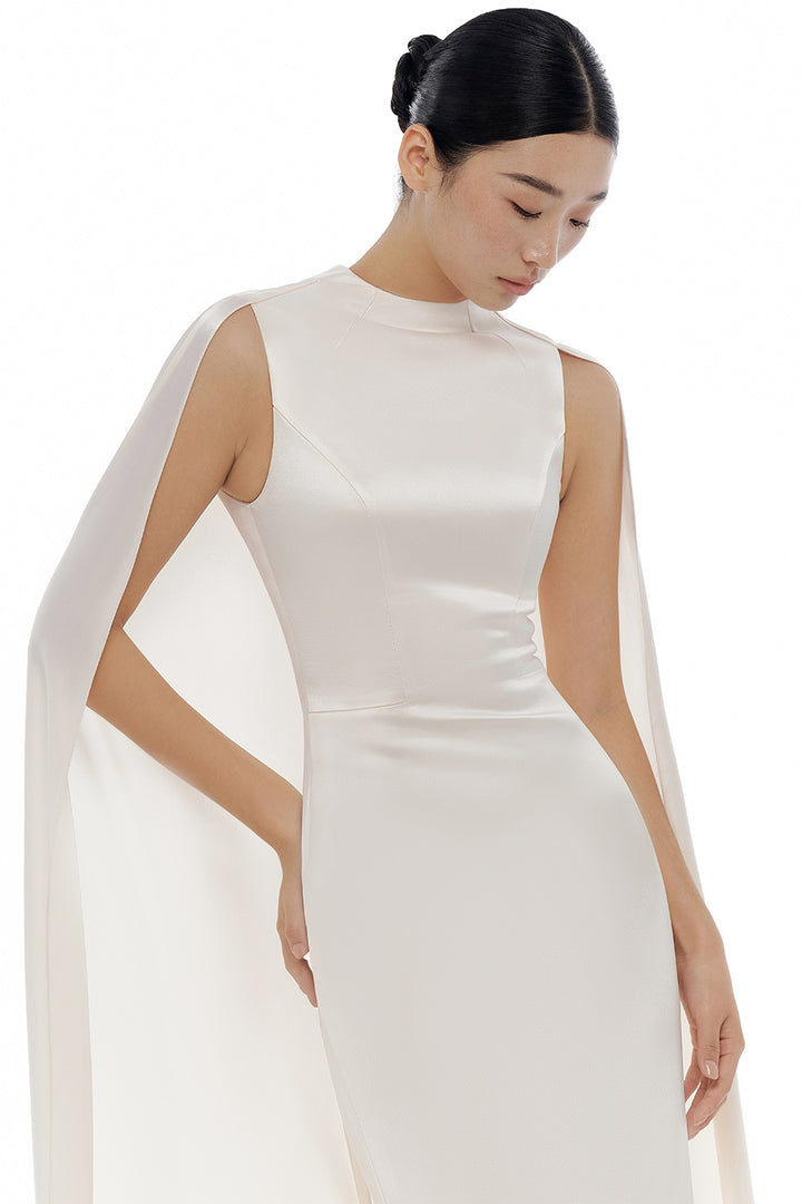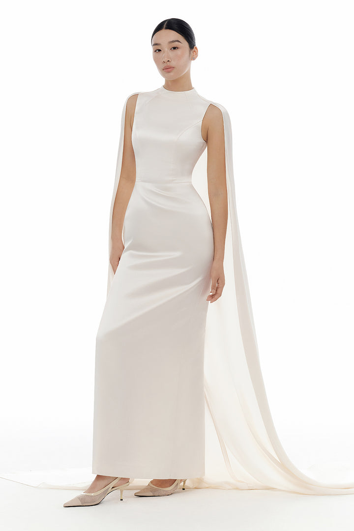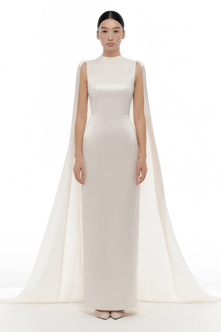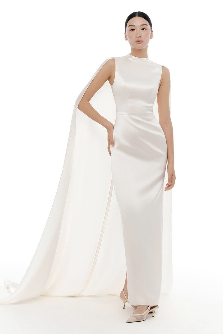 | Special Features | Attached extra long cape at the back, High slit back skirt, Dart line |