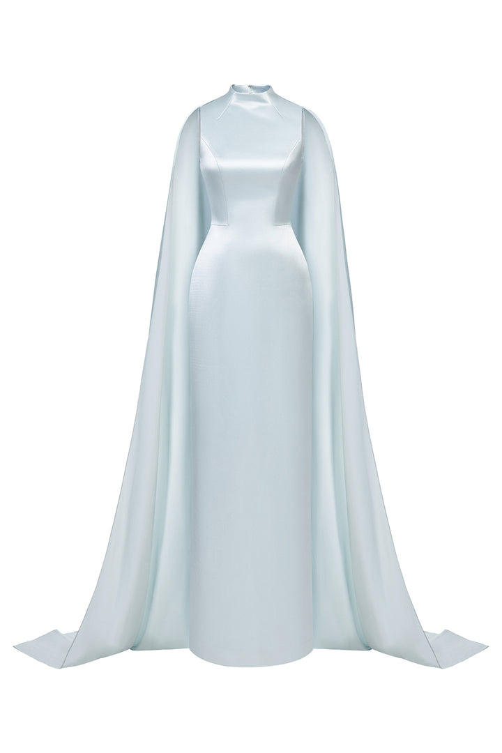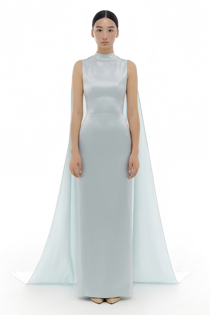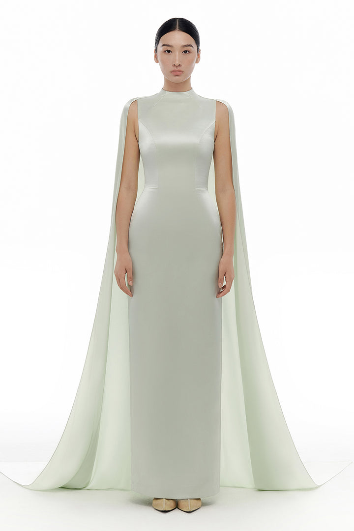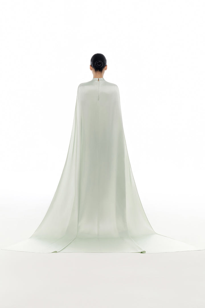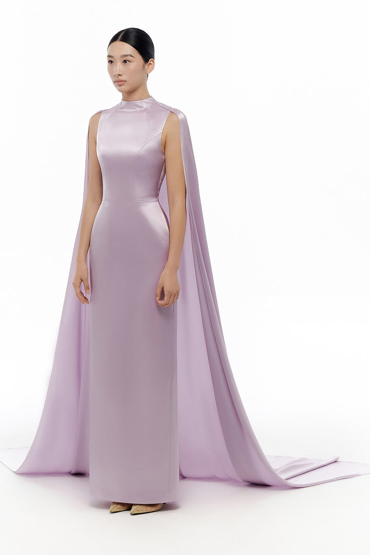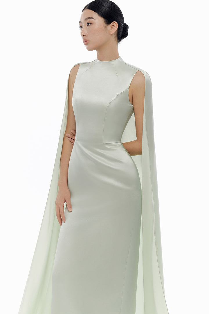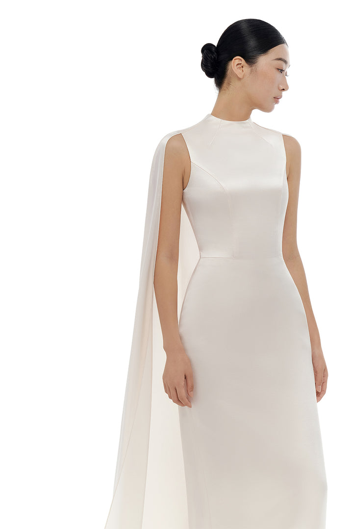 | Special Features | Attached extra long cape at the back, High slit back skirt, Dart line |