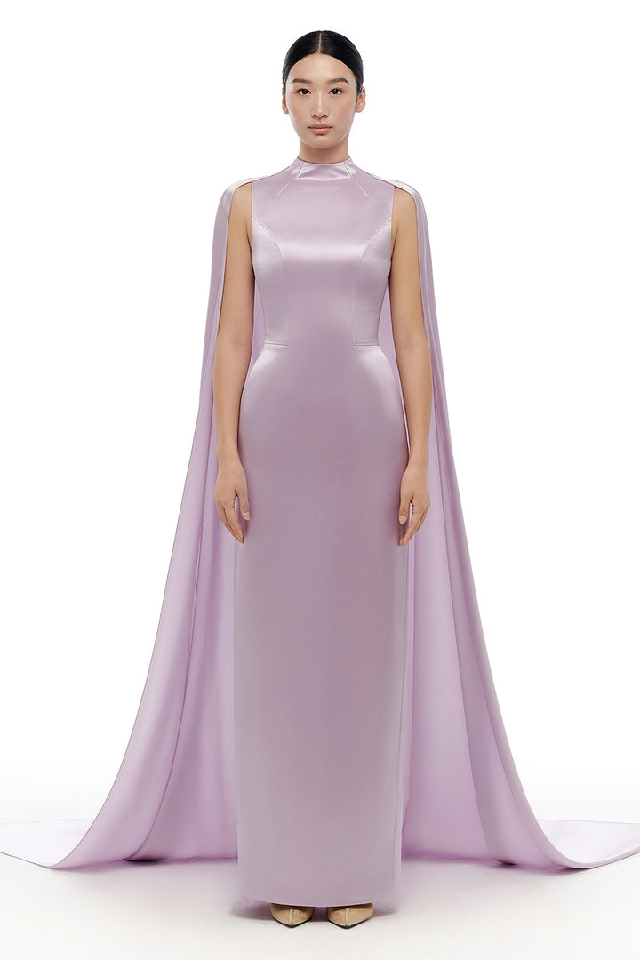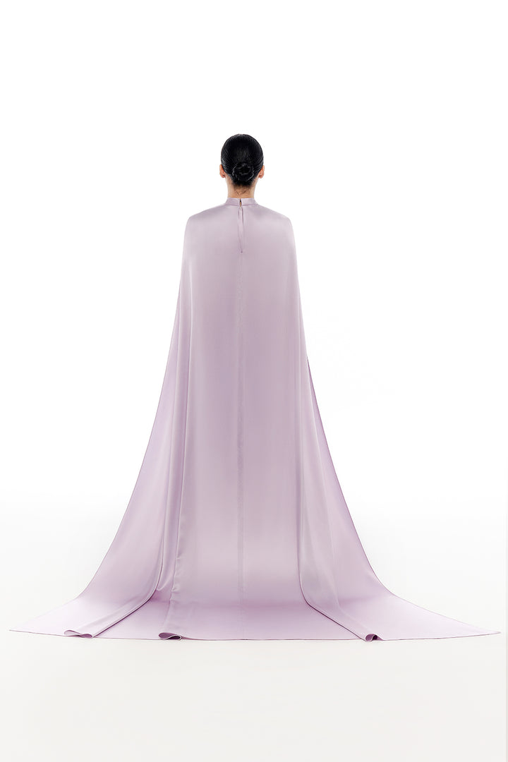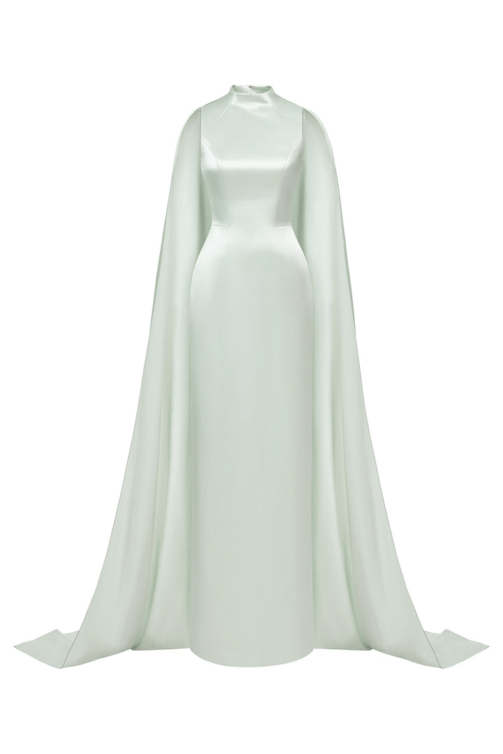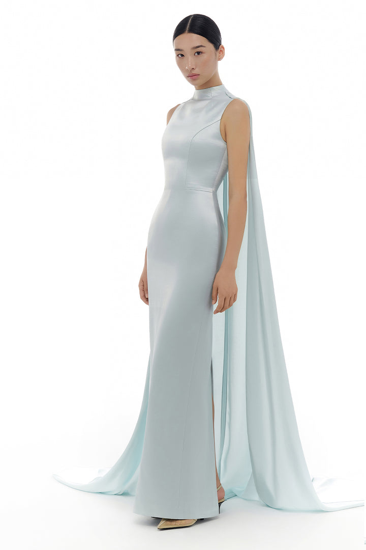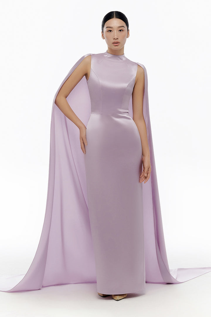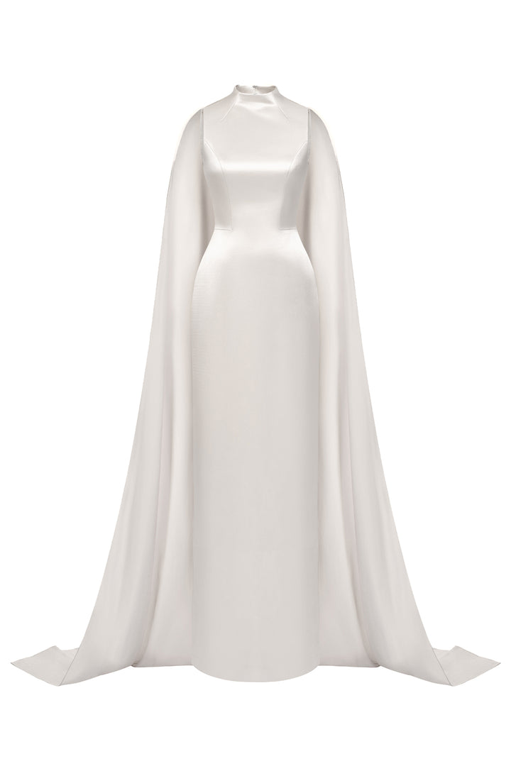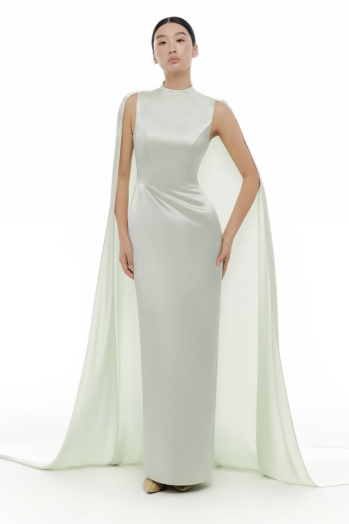 | Special Features | Attached extra long cape at the back, High slit back skirt, Dart line |