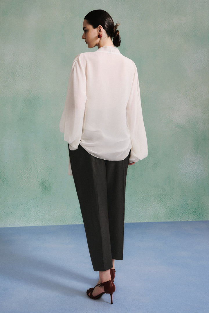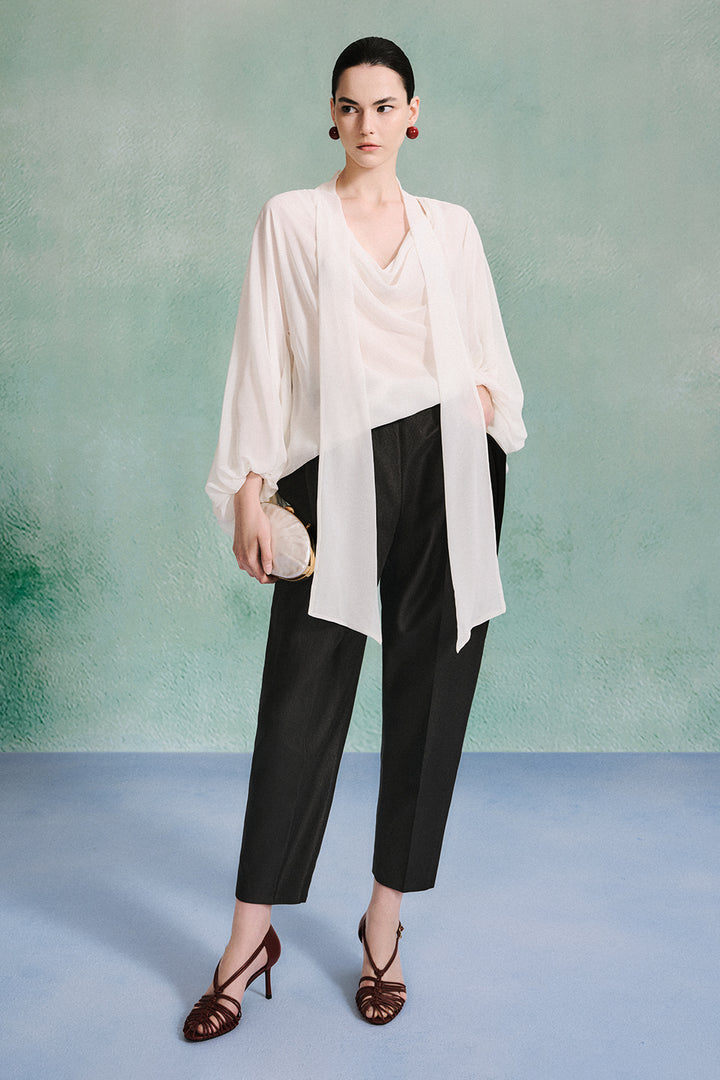 Elevate your wardrobe with the top. Crafted from lightweight chiffon, it features a bold scarf neck detail and voluminous blouson sleeves, creating a striking silhouette that commands attention. Perfect for those who dare to stand out, this top pairs effortlessly with tailored pants or a sleek skirt to make a fearless fashion statement.