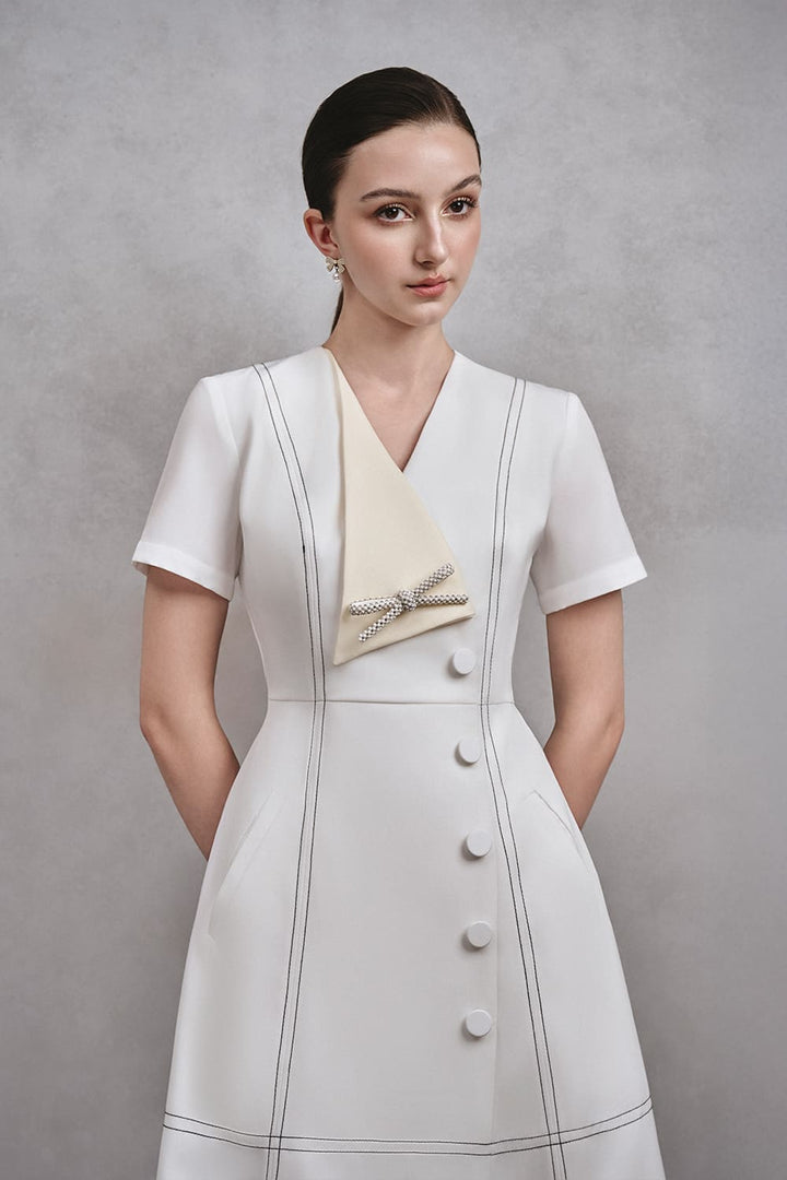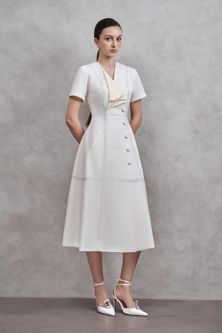 | Special Features | Triangular asymmetric flap with bow brooch, Dart lines along the dress, Buttons row on the side, Prominent black stiches, Side pockets |