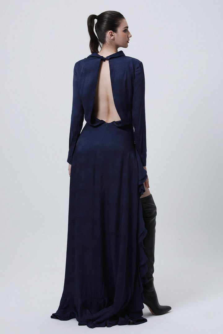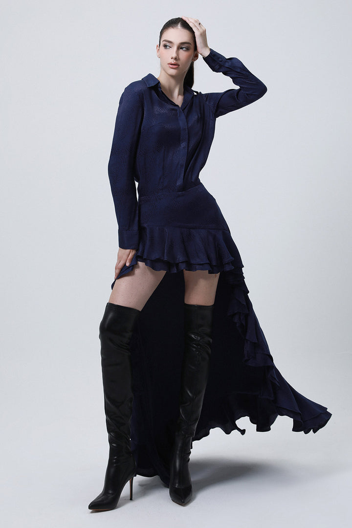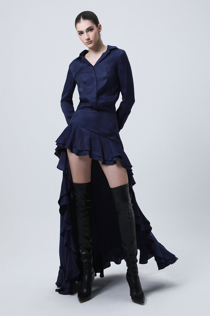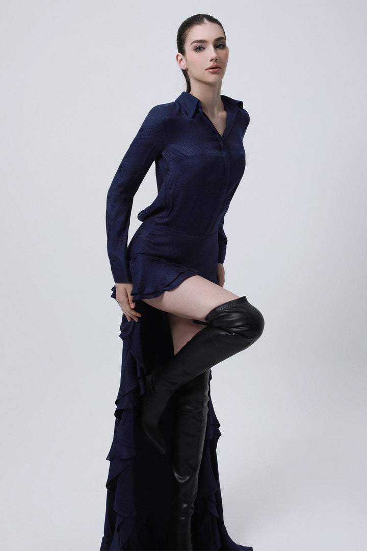 Divergence Drop Waist Collared Neck Silk High-low Dress