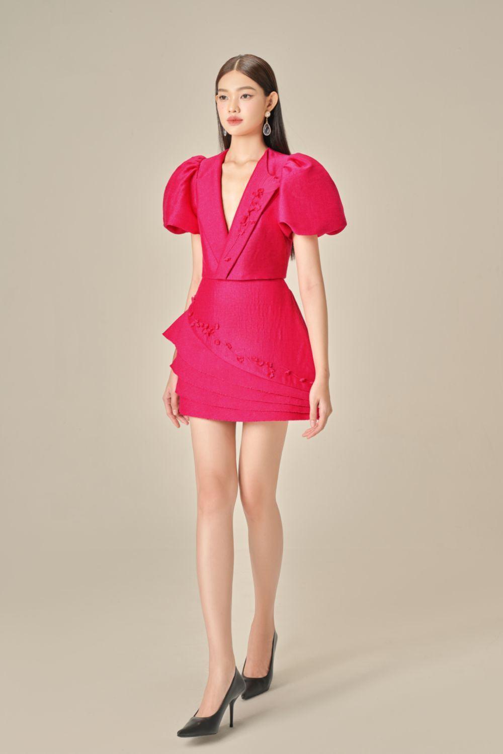 Embroidered flowers on the lapel and skirt, Curve pleated on the skirt, Deep V-neck