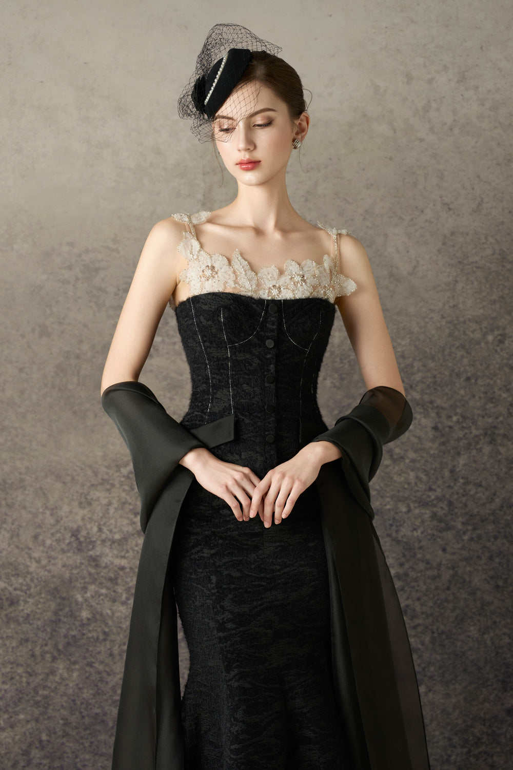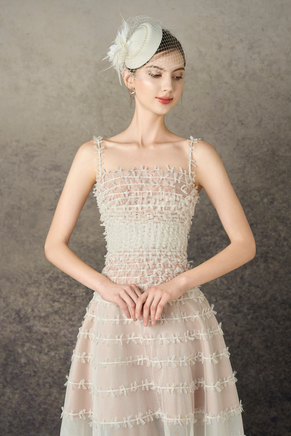 Attached pearls, feather and mesh