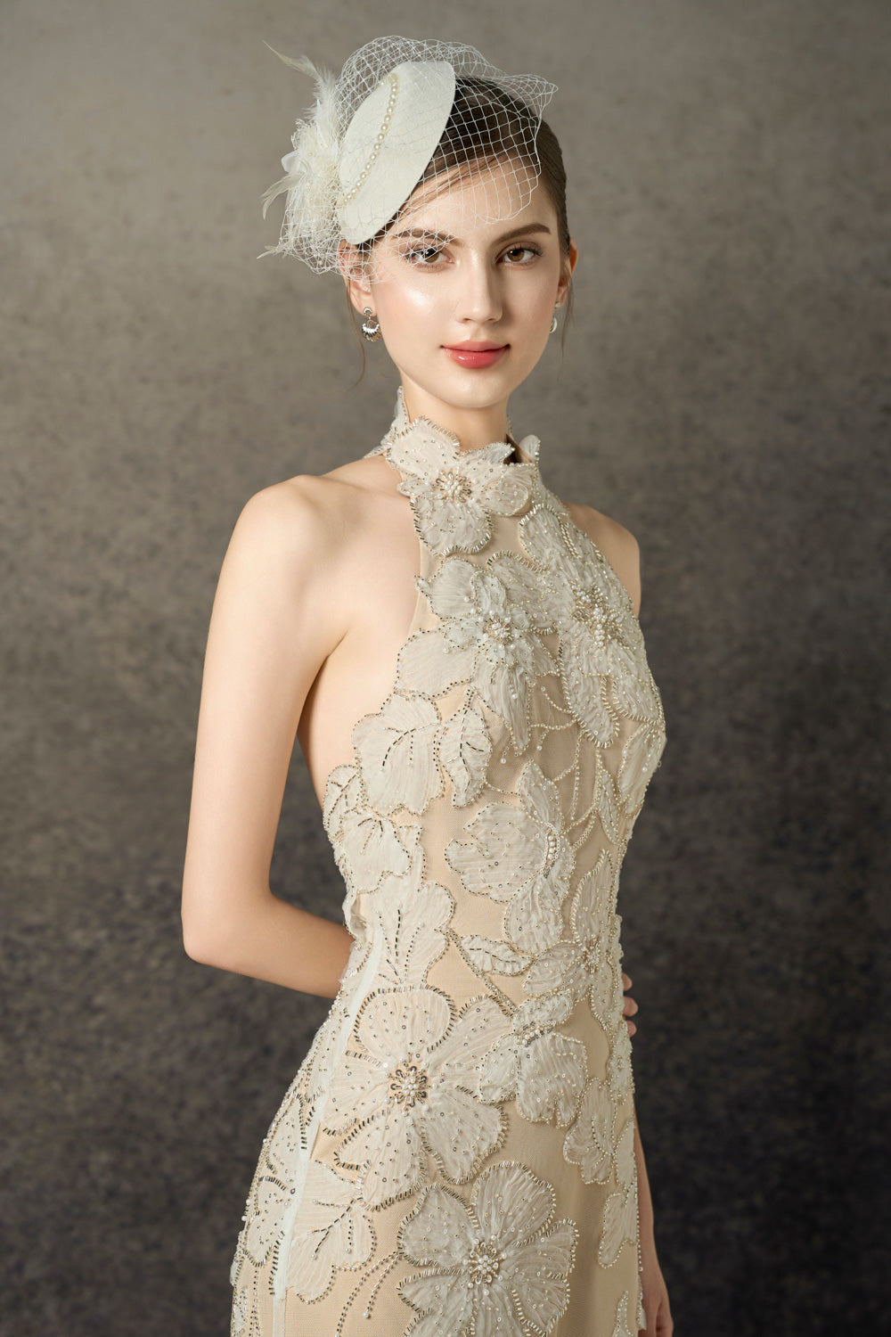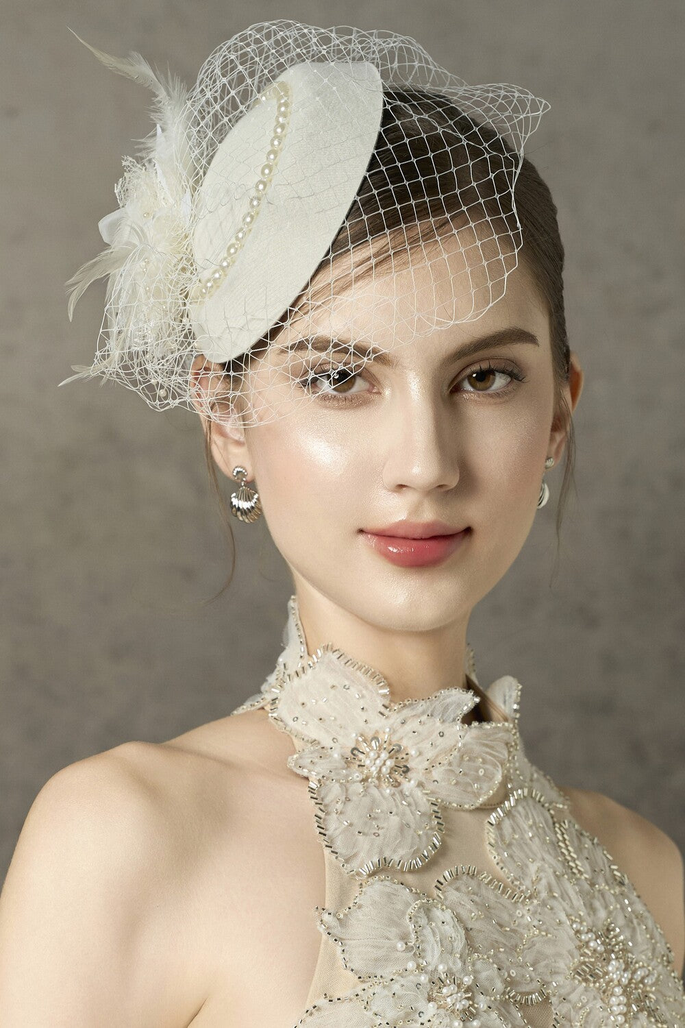 The hat is a refined fascinator crafted from a sophisticated blend of tweed, lace, and delicate beads. This expertly designed accessory offers a harmonious balance of texture and elegance, making it an exceptional choice for elevating formal attire with subtle yet striking detail.
