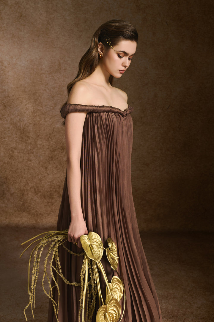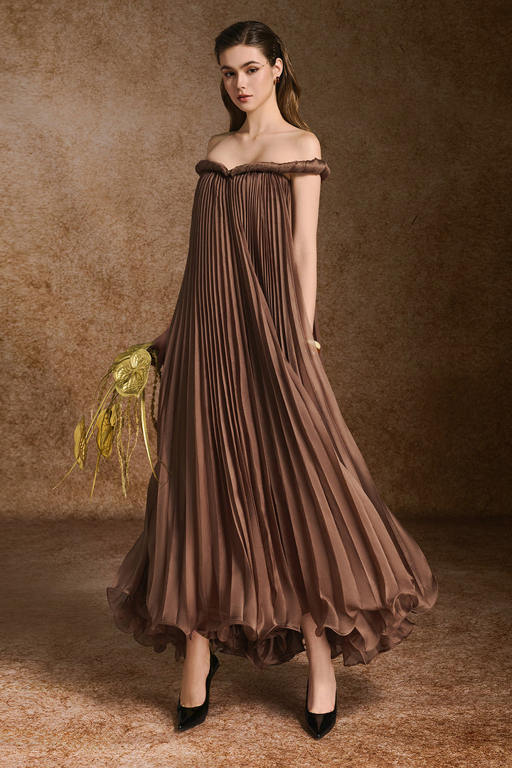 This maxi dress features a delicately pleated bodice that enhances its elegant silhouette. Crafted from lightweight silk organza, it offers a graceful drape and subtle sheen. The off-shoulder design adds a refined, contemporary touch, making it ideal for formal occasions where sophistication and comfort are paramount.