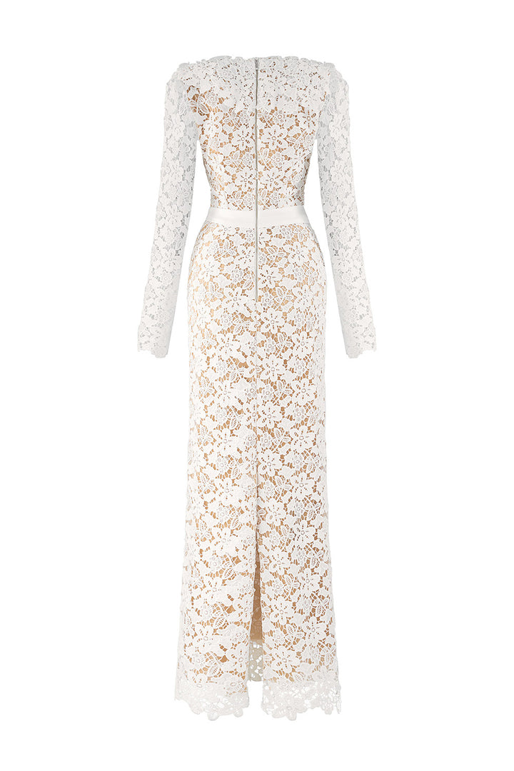 | Special Features | Fitted waist with white waistband, Plunging neck with Chelsea lace collar, Nude lining, Lace trimming, Slit back |