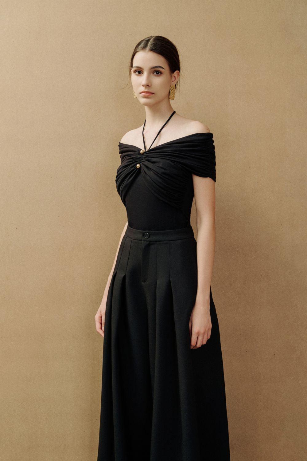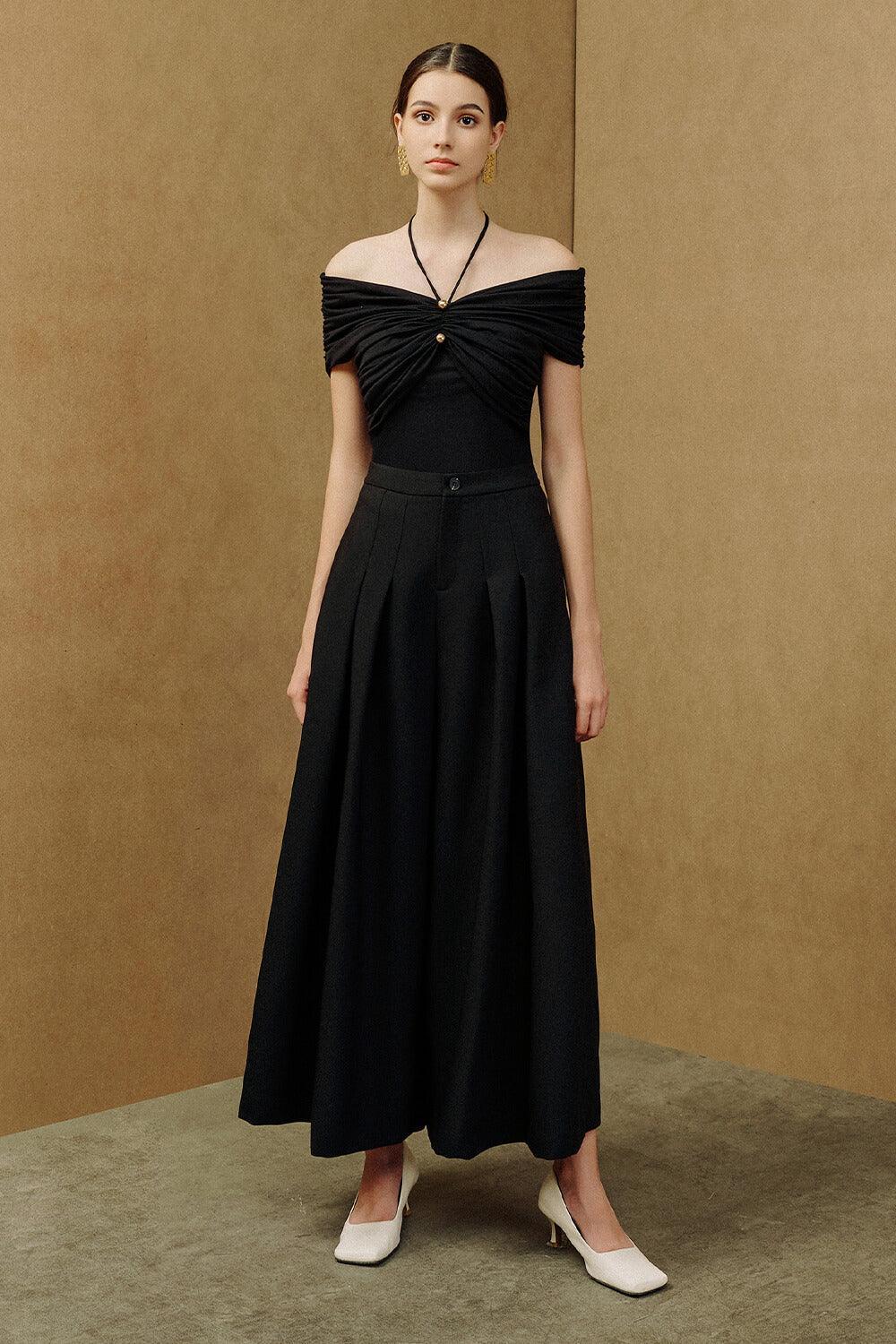 Front fly zipper with button, Box pleated, Large skirt-shaped tube