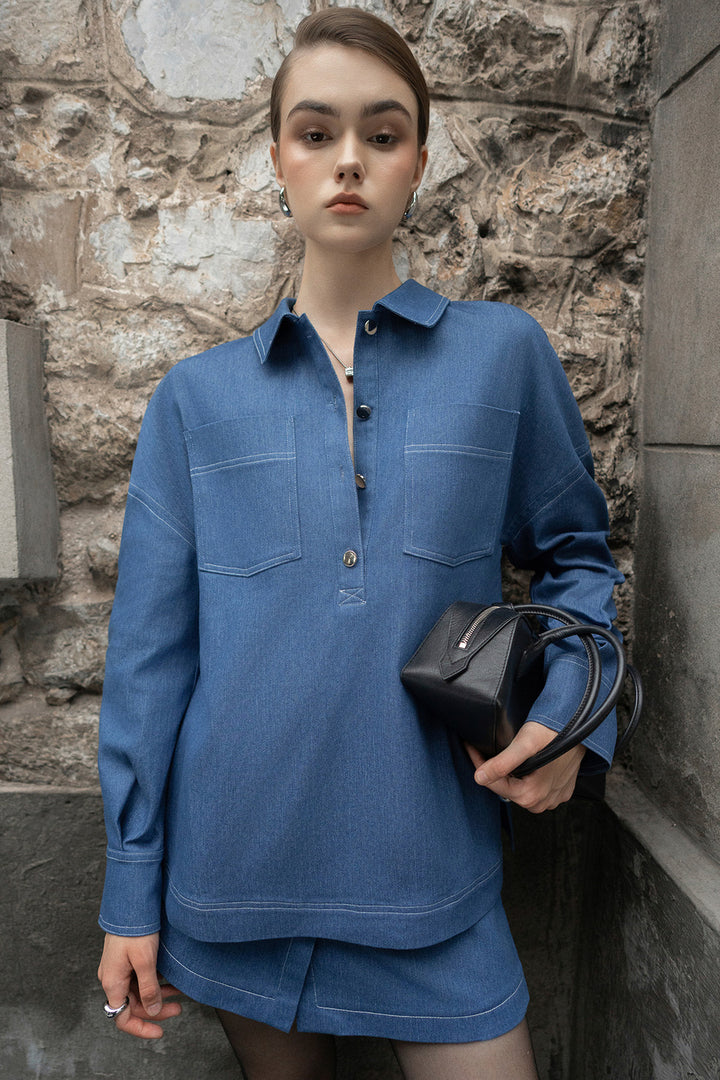 This skort features a high-waisted design with two-layer construction, combining the look of a skirt with the comfort and practicality of shorts. Crafted from durable denim, it offers a flattering silhouette and functional patch pockets, making it a versatile piece for both casual and stylish outfits.