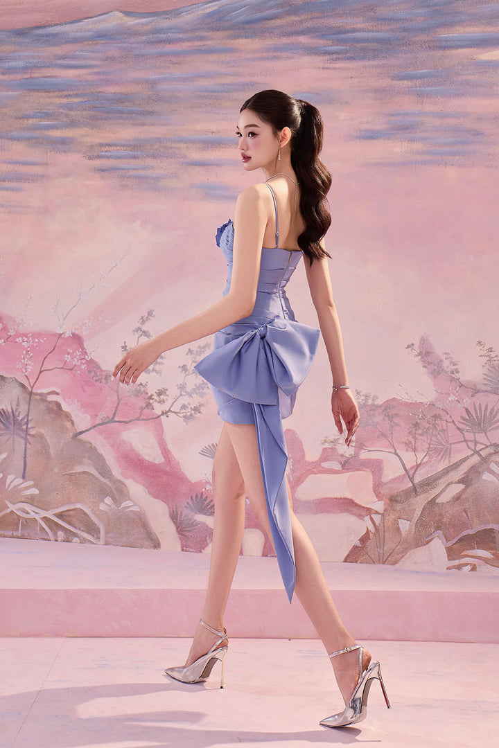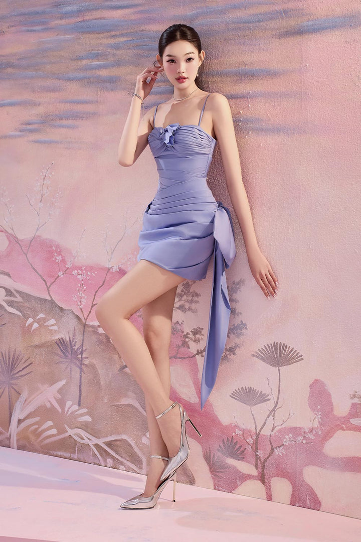 Special Features Chest cup with pintuck detail, Twisted bow tie at the middle, Fitted waist and skirt with draped design, Attached tremendous bow with long ribbon
